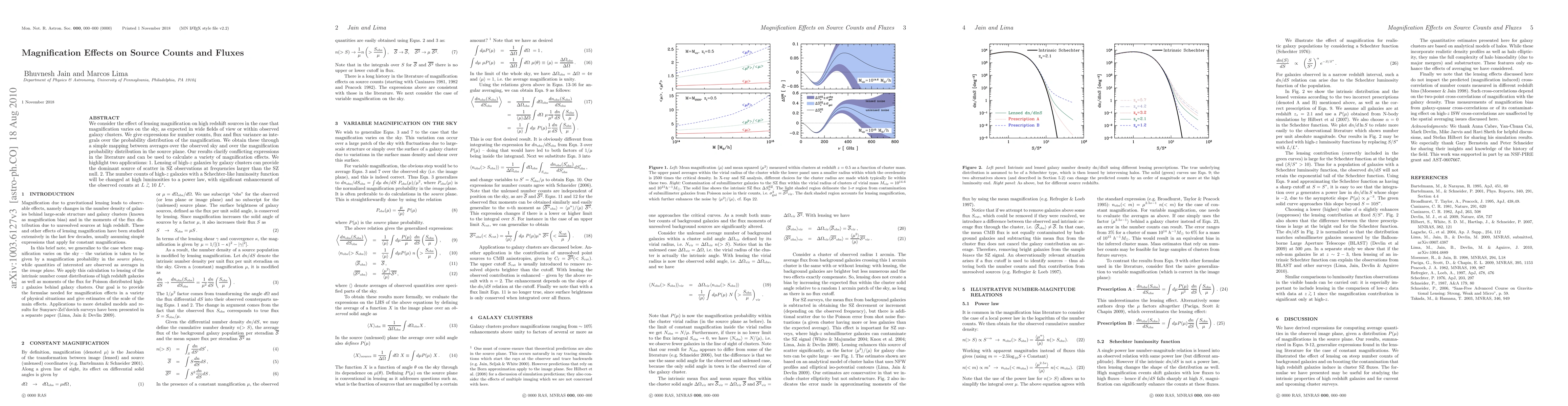 This paper examines the impact of lensing magnification on high-redshift sources, providing expressions for number counts, flux, and flux variance through integration over magnification probability distributions. It resolves conflicting literature and highlights applications such as the dominant lensing scatter in SZ observations and the transformation of high-luminosity galaxy number counts into a power law.