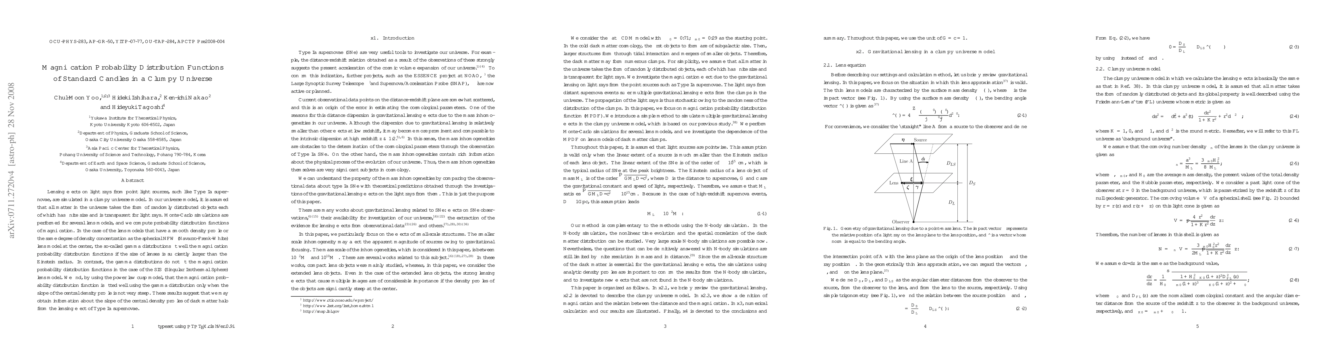 Lensing effects on light rays from point light sources, such like Type Ia supernovae, are simulated in a clumpy universe model. In our universe model, it is assumed that all matter in the universe takes the form of randomly distributed objects each of which has finite size and is transparent for light rays. Monte-Carlo simulations are performed for several lens models, and we compute probability distribution functions of magnification. In the case of the lens models that have a smooth density profile or the same degree of density concentration as the spherical NFW (Navarro-Frenk-White) lens model at the center, the so-called gamma distributions fit well the magnification probability distribution functions if the size of lenses is sufficiently larger than the Einstein radius. In contrast, the gamma distributions do not fit the magnification probability distribution functions in the case of the SIS (Singular Isothermal Sphere) lens model. We find, by using the power law cusp model, that the magnification probability distribution function is fitted well using the gamma distribution only when the slope of the central density profile is not very steep. These results suggest that we may obtain information about the slope of the central density profiles of dark matter halo from the lensing effect of Type Ia supernovae.