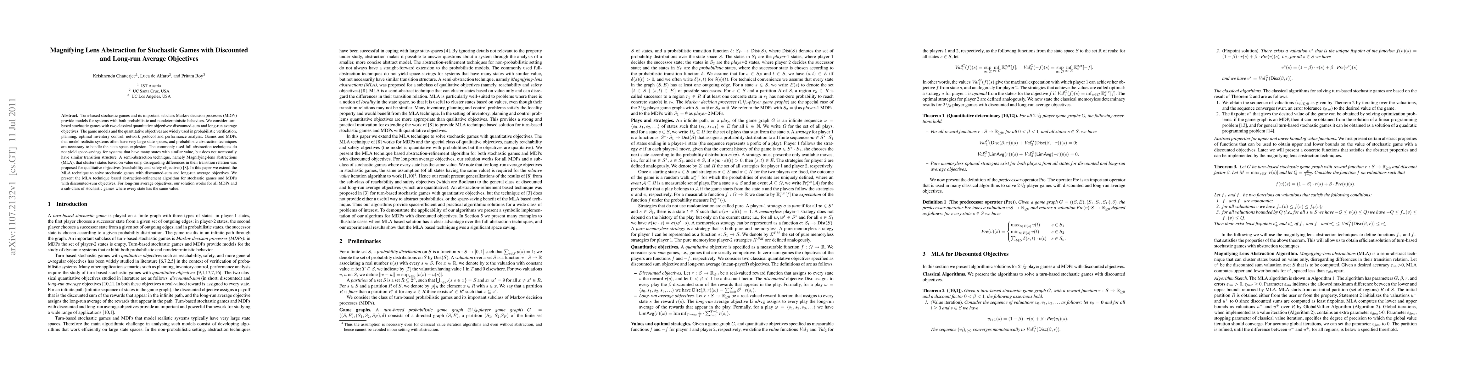 This paper extends Magnifying-lens abstractions (MLA) to stochastic games and Markov decision processes (MDPs) for discounted-sum and long-run average objectives, proposing an abstraction-refinement algorithm that clusters states based on value to manage large state spaces. The MLA technique is effective for systems with many similar value states but differing transition structures.
