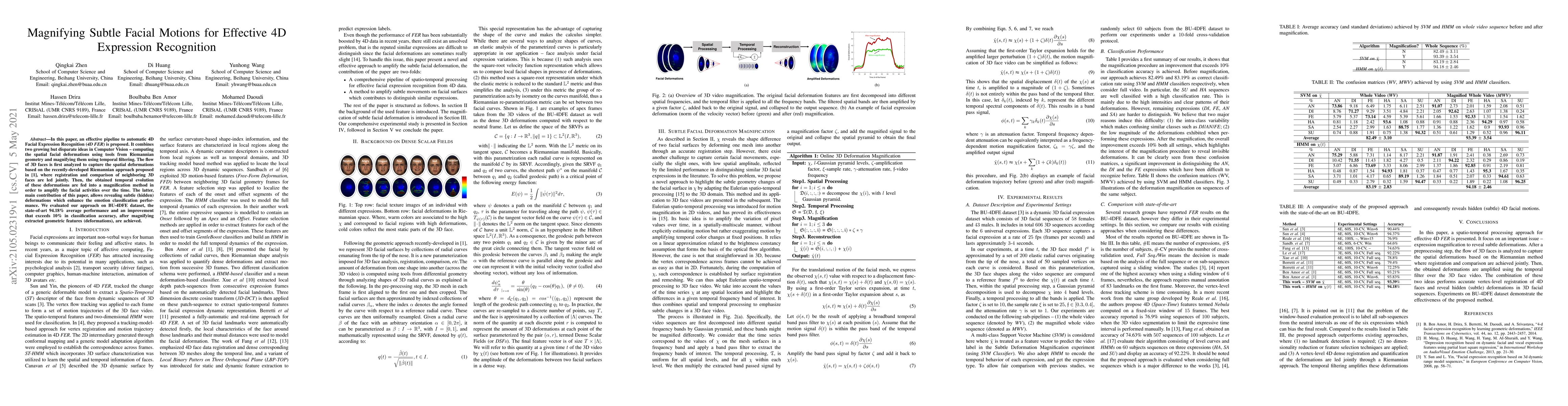 In this paper, an effective pipeline to automatic 4D Facial Expression Recognition (4D FER) is proposed. It combines two growing but disparate ideas in Computer Vision -- computing the spatial facial deformations using tools from Riemannian geometry and magnifying them using temporal filtering. The flow of 3D faces is first analyzed to capture the spatial deformations based on the recently-developed Riemannian approach, where registration and comparison of neighboring 3D faces are led jointly. Then, the obtained temporal evolution of these deformations are fed into a magnification method in order to amplify the facial activities over the time. The latter, main contribution of this paper, allows revealing subtle (hidden) deformations which enhance the emotion classification performance. We evaluated our approach on BU-4DFE dataset, the state-of-art 94.18% average performance and an improvement that exceeds 10% in classification accuracy, after magnifying extracted geometric features (deformations), are achieved.