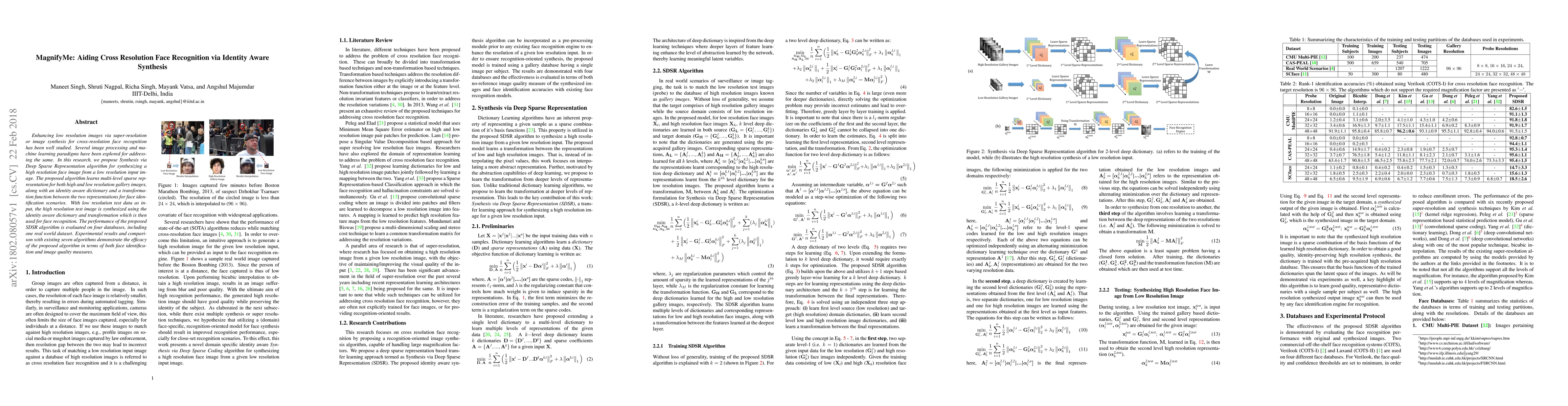 The paper proposes a Synthesis via Deep Sparse Representation (SDSR) algorithm to enhance low resolution face images for cross-resolution recognition, utilizing an identity-aware dictionary and transformation. The SDSR algorithm outperforms existing methods in both face identification accuracy and image quality across multiple datasets.