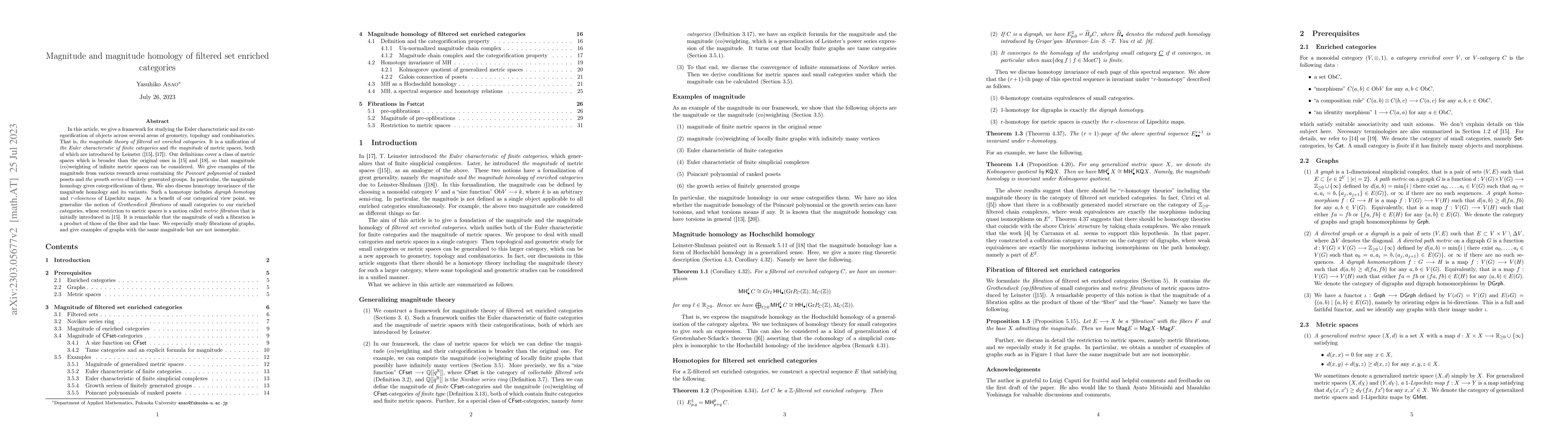 The paper introduces magnitude and magnitude homology for filtered set-enriched categories, generalizing previous work on magnitude of metric spaces and Euler characteristic of finite categories, and establishes their connections to various combinatorial and geometric invariants.