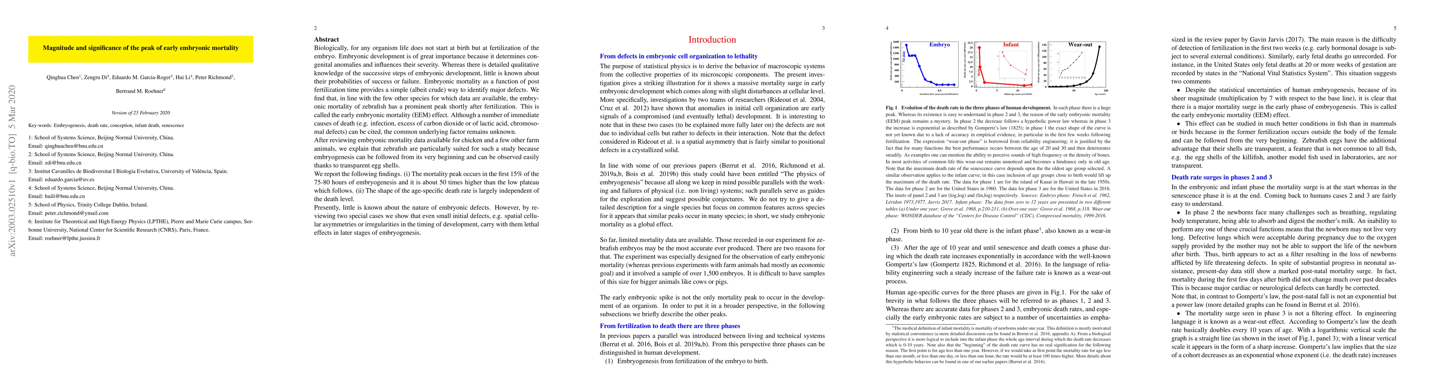 Biologically, for any organism life does not start at birth but at fertilization of the embryo. Embryonic development is of great importance because it determines congenital anomalies and influences their severity. Whereas there is detailed qualitative knowledge of the successive steps of embryonic development, little is known about their probabilities of success or failure. Embryonic mortality as a function of post fertilization time provides a simple (albeit crude) way to identify major defects. We find that, in line with the few other species for which data are available, the embryonic mortality of zebrafish has a prominent peak shortly after fertilization. This is called the early embryonic mortality (EEM) effect. Although a number of immediate causes of death (e.g. infection, excess of carbon dioxide or of lactic acid, chromosomal defects) can be cited, the common underlying factor remains unknown. After reviewing embryonic mortality data available for chicken and a few other farm animals, we explain that zebrafish are particularly suited for such a study because embryogenesis can be followed from its very beginning and can be observed easily thanks to transparent egg shells. We report the following findings. (i) The mortality peak occurs in the first 15% of the 75-80 hours of embryogenesis and it is about 50 times higher than the low plateau which follows. (ii) The shape of the age-specific death rate is largely independent of the death level. Presently, little is known about the nature of embryonic defects. However, by reviewing two special cases we show that even small initial defects, e.g. spatial cellular asymmetries or irregularities in the timing of development, carry with them lethal effects in later stages of embryogenesis.