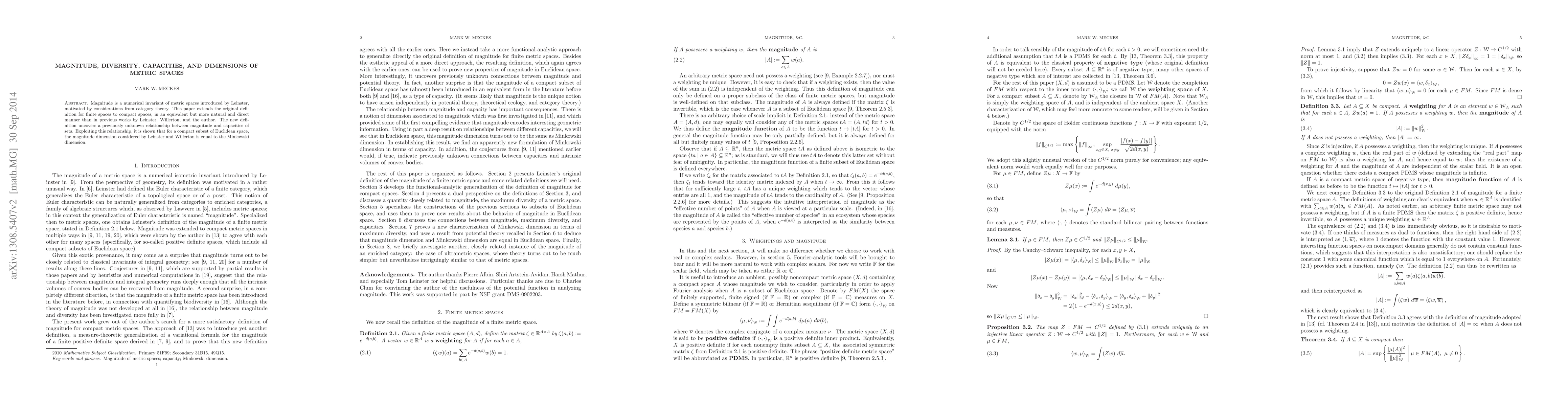 Researchers extend the concept of magnitude to compact spaces, revealing a new relationship between magnitude and capacities, and showing that magnitude dimension is equal to Minkowski dimension in compact subsets of Euclidean space.