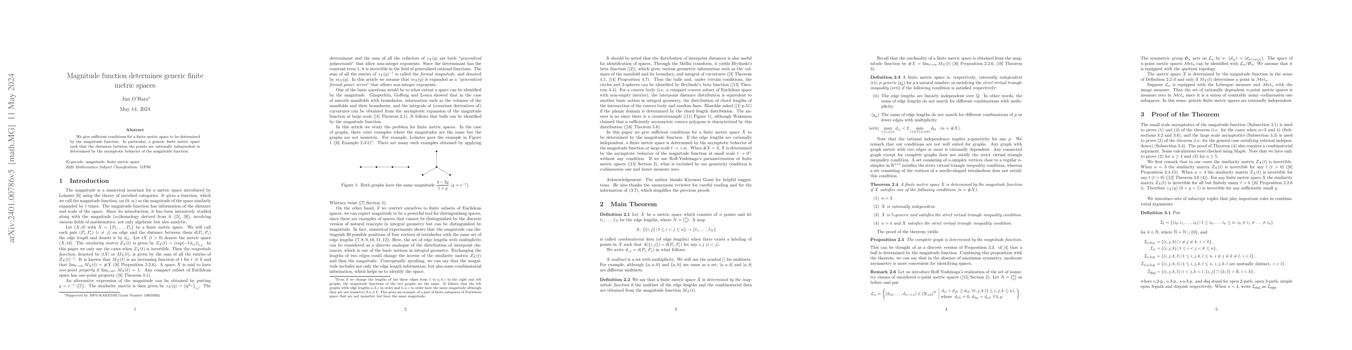 Summary: This paper provides conditions under which a generic finite metric space with rationally independent distances is uniquely determined by the asymptotic behavior of its magnitude function. The magnitude function plays a crucial role in identifying such metric spaces.
