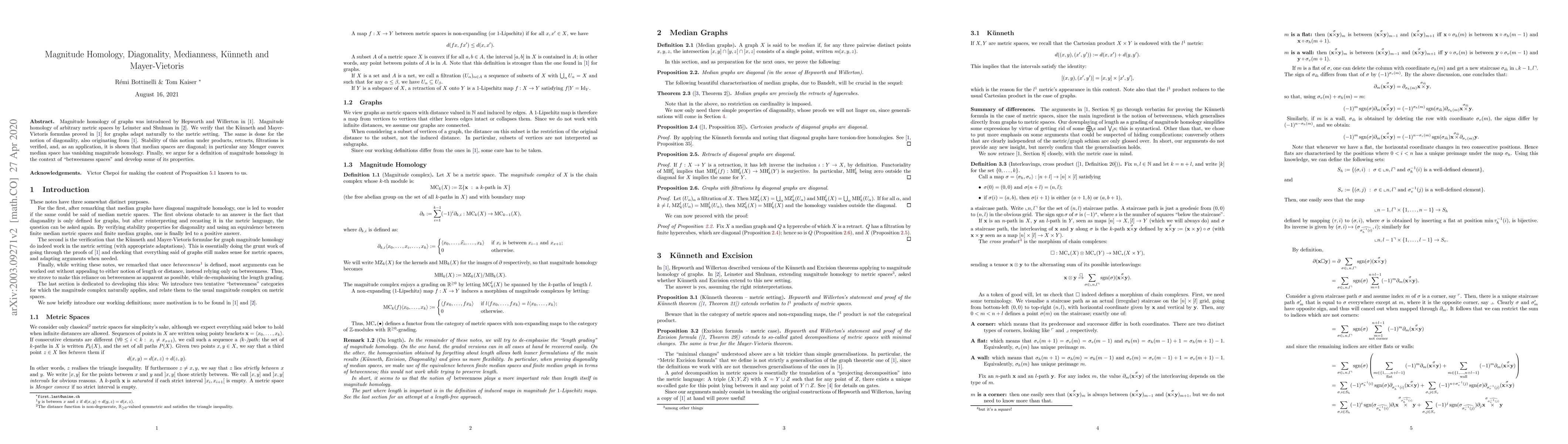 Magnitude homology of graphs is introduced by Hepworth and Willerton in arXiv:1505.04125 . Magnitude homology of arbitrary metric spaces by Leinster and Shulman in arXiv:1711.00802v2 . We verify that the K\"unneth and Mayer-Vietoris formulas proved in arXiv:1505.04125 for graphs extend naturally to the metric setting. The same is done for the notion of diagonality, also originating from arXiv:1505.04125 . Stability of this notion under products, retracts, filtrations is verified, and as an application, it is shown that median spaces are diagonal; in particular, any Menger convex median space has vanishing magnitude homology. Finally, we argue for a definition of magnitude homology in the context of "betweenness spaces" and develop some of its properties.