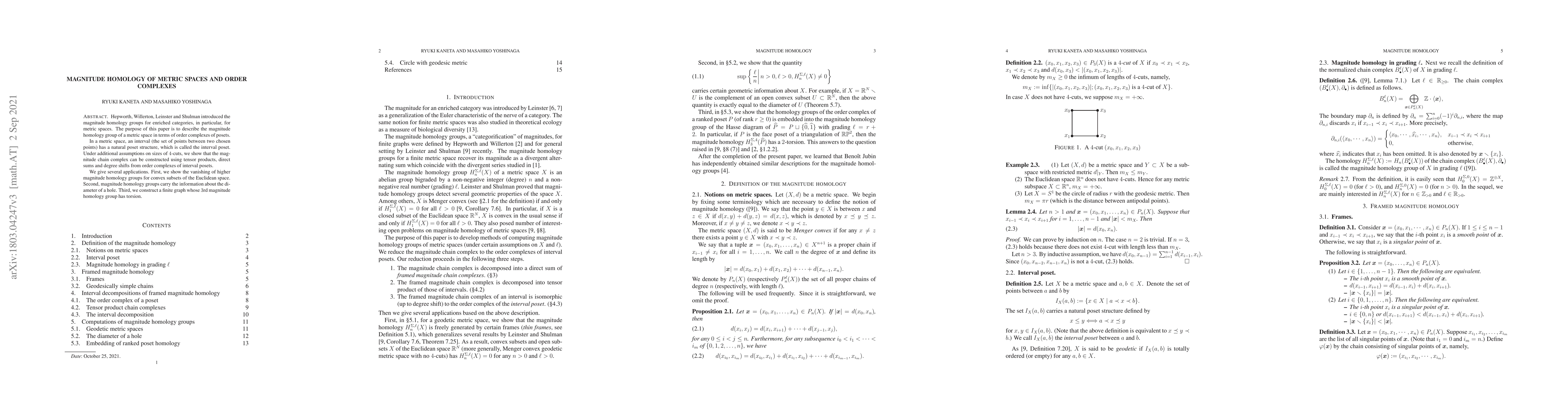 This paper explores the magnitude homology of metric spaces, demonstrating its construction via order complexes of interval posets under certain conditions. It also highlights applications, including the vanishing of higher homology groups for convex subsets and the detection of hole diameters.