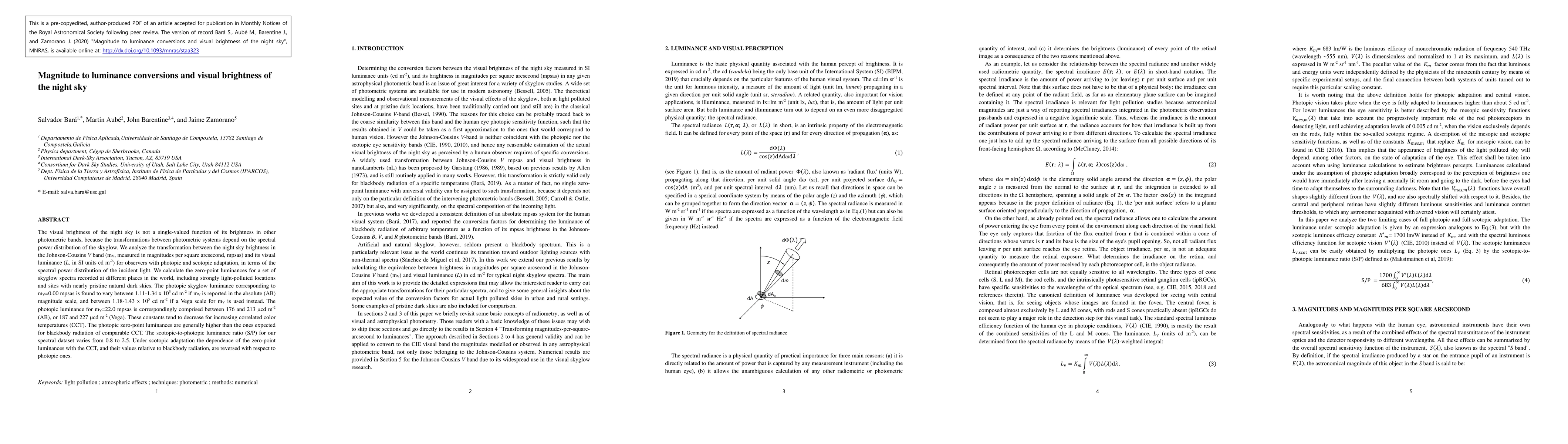 This paper investigates the conversion between night sky brightness in the Johnson-Cousins V band and its visual luminance, revealing that the transformation depends on the spectral power distribution of skyglow. The study finds that photopic luminances for mV=0.00 mpsas range from 1.11-1.43 x 10^5 cd m^-2, while for mV=22.0 mpsas, they range from 176-227 microcd m^-2, with values decreasing for higher correlated color temperatures.
