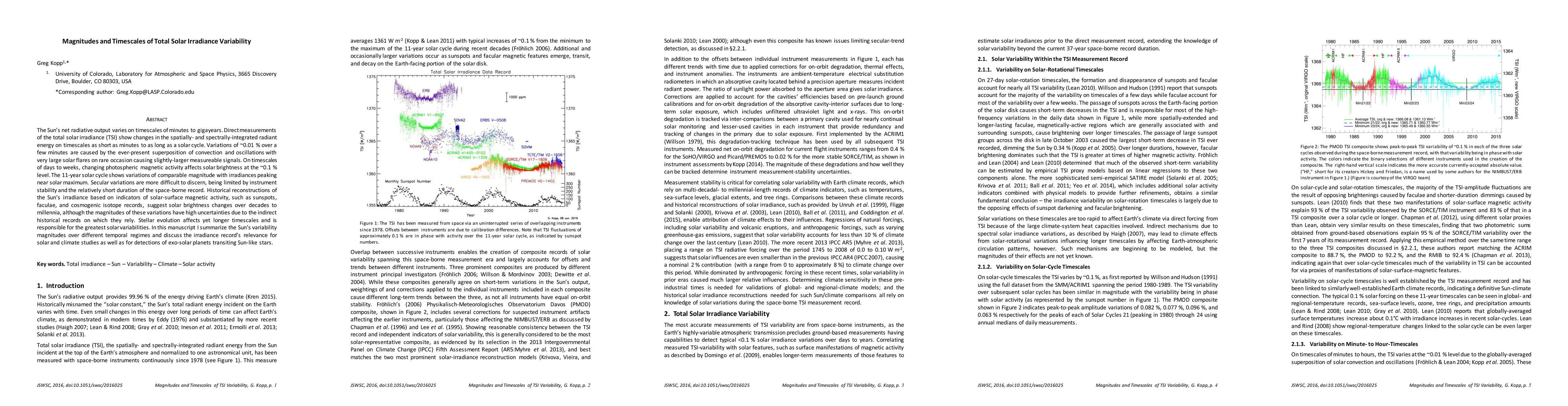 This paper summarizes the magnitudes and timescales of the Sun's total solar irradiance (TSI) variability, ranging from minutes to gigayears. It highlights the influence of solar activity, the 11-year solar cycle, and stellar evolution on TSI, and discusses its implications for solar and climate studies, as well as for detecting exoplanets.