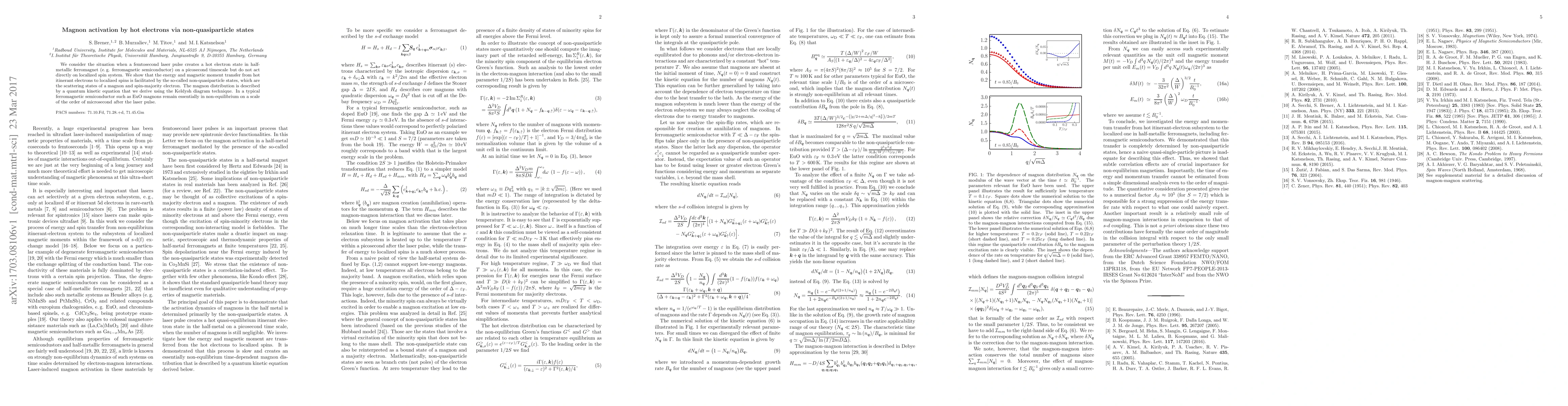 This research demonstrates that hot electrons generated by femtosecond laser pulses in half-metallic ferromagnets can transfer energy and magnetic moment to localized spins via non-quasiparticle states, which are scattering states of magnons and spin-majority electrons. The study uses a quantum kinetic equation derived via Keldysh diagram technique, revealing that magnons in ferromagnetic semiconductors like EuO can stay non-equilibrium for microseconds post-laser pulse.