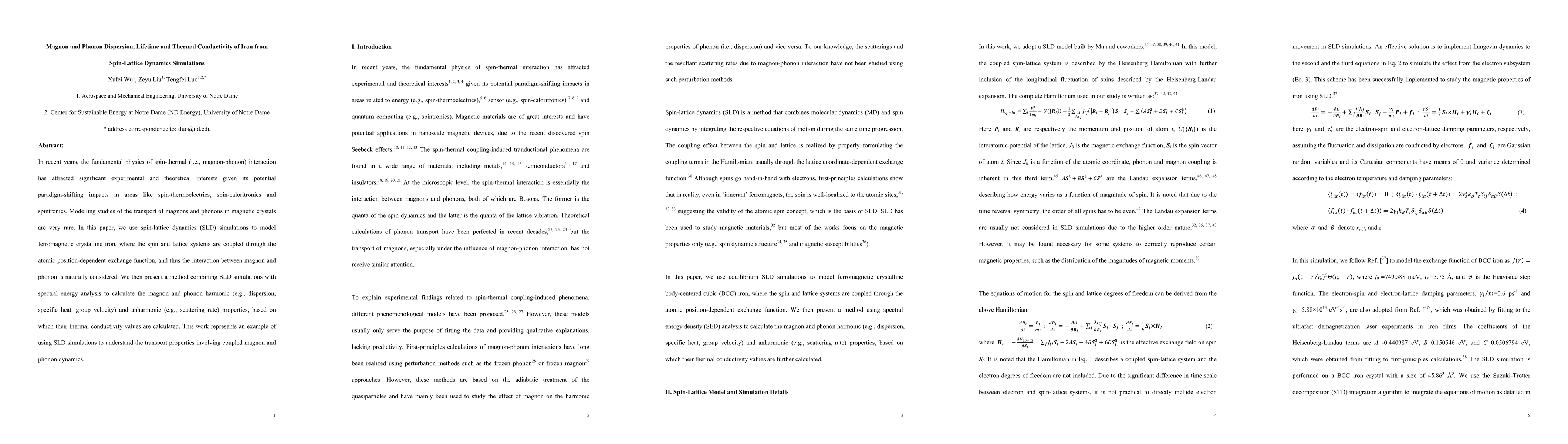 This paper employs spin-lattice dynamics simulations to model ferromagnetic iron, analyzing magnon and phonon dispersion, lifetime, and thermal conductivity through coupled spin-lattice interactions. The study combines spectral energy analysis with SLD simulations to determine the transport properties of magnon-phonon dynamics.