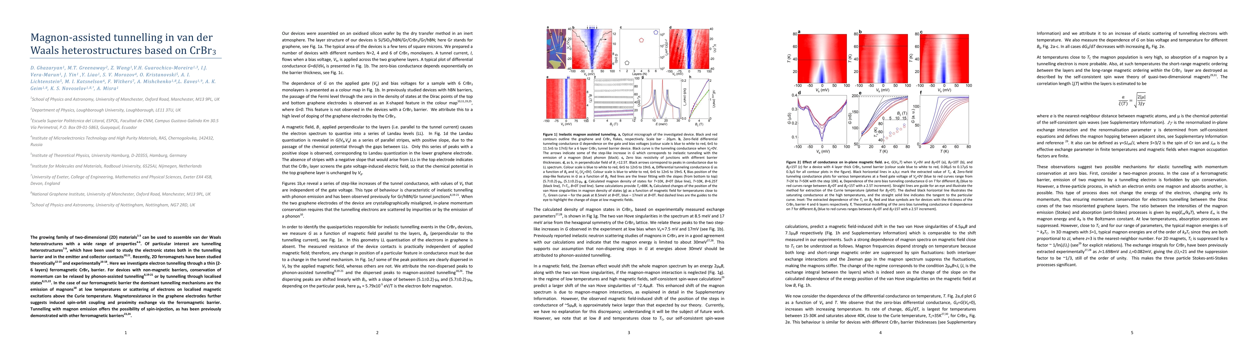 The growing family of two-dimensional (2D) materials that are now available can be used to assemble van der Waals heterostructures with a wide range of properties. Of particular interest are tunnelling heterostructures, which have been used to study the electronic states both in the tunnelling barrier and in the emitter and collector contacts. Recently, 2D ferromagnets have been studied theoretically and experimentally. Here we investigate electron tunnelling through a thin (2-6 layers) ferromagnetic CrBr3 barrier. For devices with non-magnetic barriers, conservation of momentum can be relaxed by phonon-assisted tunnelling or by tunnelling through localised states. In the case of our ferromagnetic barrier the dominant tunnelling mechanisms are the emission of magnons at low temperatures or scattering of electrons on localised magnetic excitations above the Curie temperature. Tunnelling with magnon emission offers the possibility of injecting spin into the collector electrode.