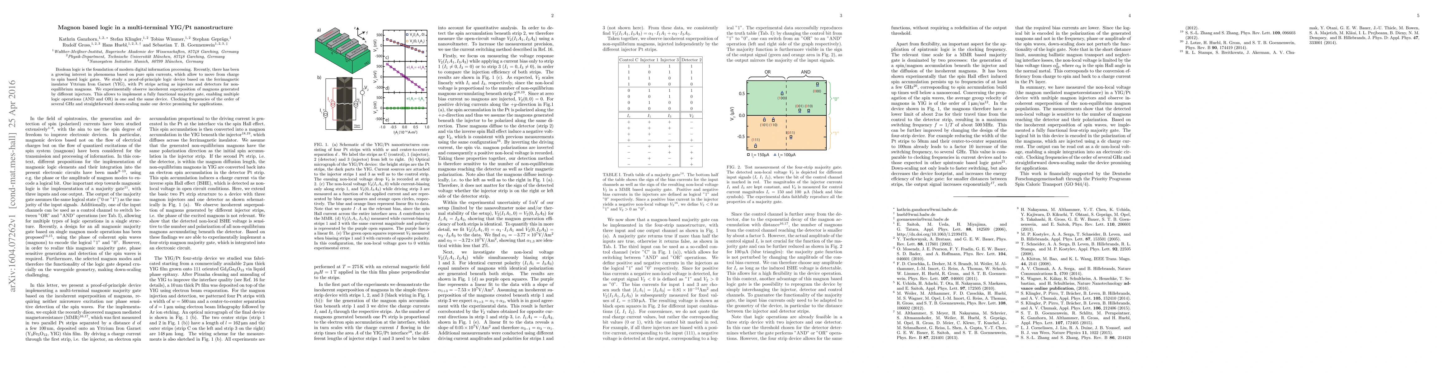 Boolean logic is the foundation of modern digital information processing. Recently, there has been a growing interest in phenomena based on pure spin currents, which allow to move from charge to spin based logic gates. We study a proof-of-principle logic device based on the ferrimagnetic insulator Yttrium Iron Garnet (YIG), with Pt strips acting as injectors and detectors for nonequilibrium magnons. We experimentally observe incoherent superposition of magnons generated by different injectors. This allows to implement a fully functional majority gate, enabling multiple logic operations (AND and OR) in one and the same device. Clocking frequencies of the order of several GHz and straightforward down-scaling make our device promising for applications.