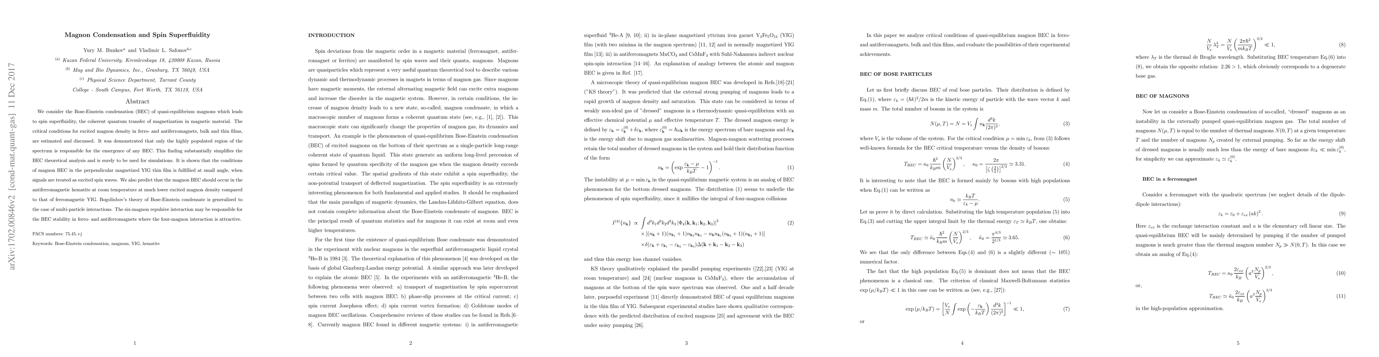 This paper explores the Bose-Einstein condensation of magnons leading to spin superfluidity in magnetic materials, surpassing classical paradigms. It estimates critical conditions for ferro- and antiferromagnets, predicting lower excited magnon density for BEC in antiferromagnetic hematite compared to ferromagnetic YIG.