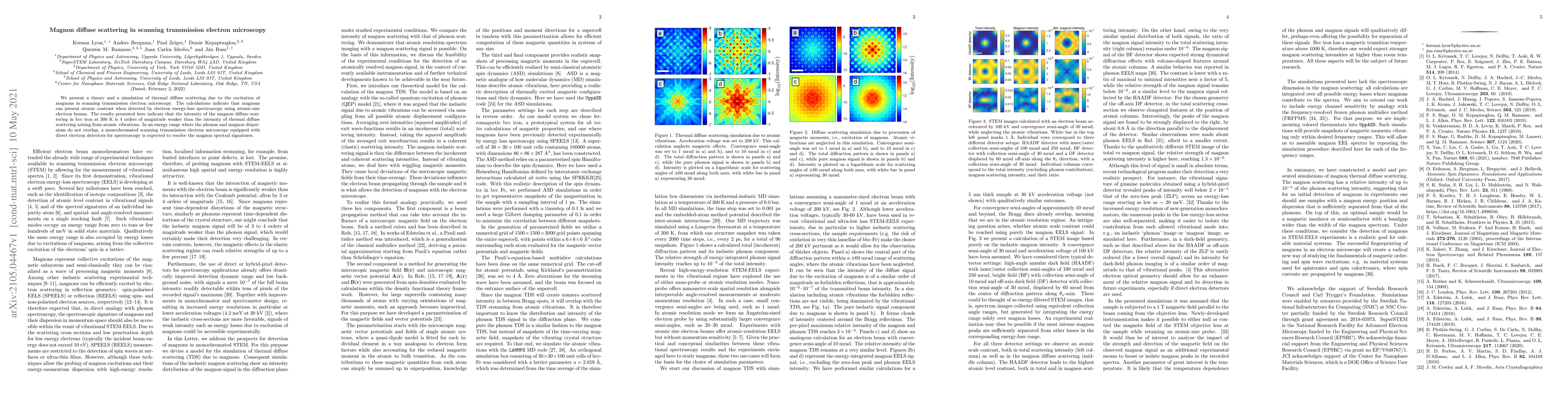 The research presents a theoretical model and simulations of thermal diffuse scattering due to magnon excitation in scanning transmission electron microscopy (STEM). It uses a multislice method based on Pauli's equation to account for the influence of microscopic magnetic fields on electron beams, a parametrization for magnetic fields and vector potentials, and semi-classical atomistic spin dynamics simulations for realistic snapshots of precessing magnetic moments.