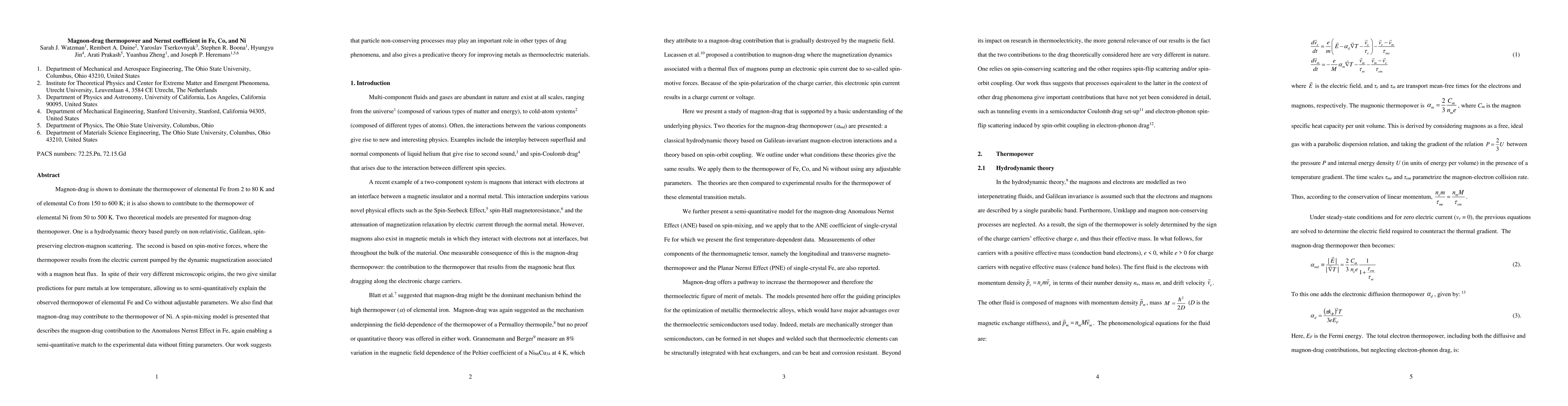 This paper investigates the magnon-drag thermopower in Fe, Co, and Ni, demonstrating its dominance in Fe and Co over specific temperature ranges and contribution in Ni. Two theoretical models are presented to explain the observed thermopower, showing similar predictions for low-temperature pure metals. The study also extends to the Nernst coefficient, providing a predictive theory for enhancing thermoelectric materials.