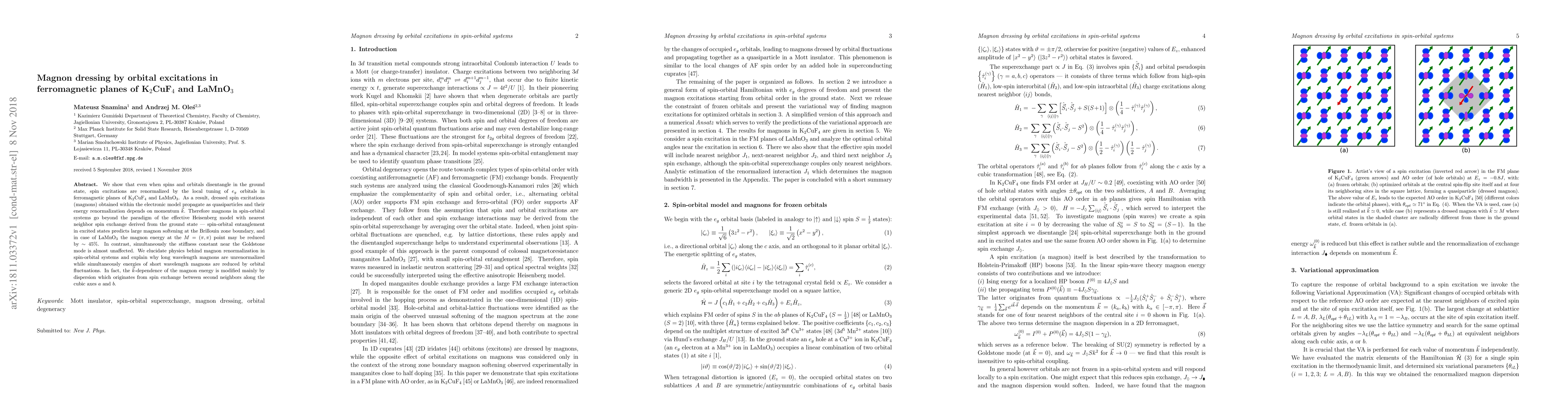 We show that even when spins and orbitals disentangle in the ground state, spin excitations are renormalized by the local tuning of $e_g$ orbitals in ferromagnetic planes of K$_2$CuF$_4$ and LaMnO$_3$. As a result, dressed spin excitations (magnons) obtained within the electronic model propagate as quasiparticles and their energy renormalization depends on momentum ${\vec k}$. Therefore magnons in spin-orbital systems go beyond the paradigm of the effective Heisenberg model with nearest neighbor spin exchange derived from the ground state --- spin-orbital entanglement in excited states predicts large magnon softening at the Brillouin zone boundary, and in case of LaMnO$_3$ the magnon energy at the $M=(\pi,\pi)$ point may be reduced by $\sim 45$\%. In contrast, simultaneously the stiffness constant near the Goldstone mode is almost unaffected. We elucidate physics behind magnon renormalization in spin-orbital systems and explain why long wavelength magnons are unrenormalized while simultaneously energies of short wavelength magnons are reduced by orbital fluctuations. In fact, the ${\vec k}$-dependence of the magnon energy is modified mainly by dispersion which originates from spin exchange between second neighbors along the cubic axes $a$ and $b$.