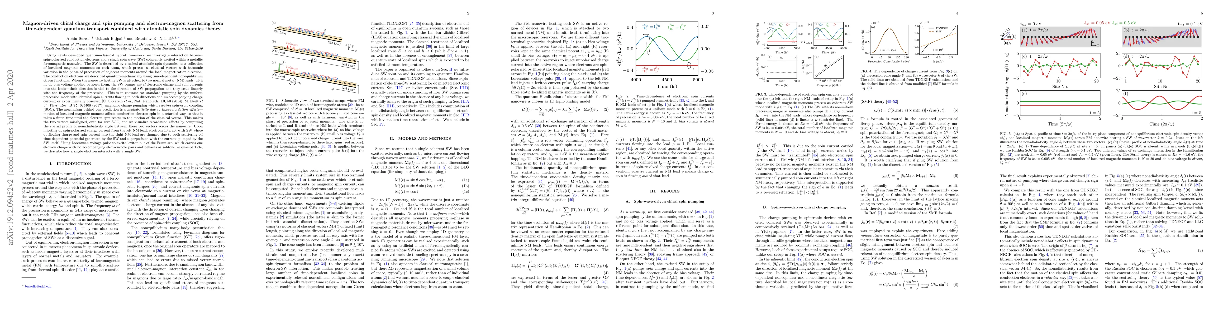 Using newly developed quantum-classical hybrid framework, we investigate interaction between spin-polarized conduction electrons and a single spin wave (SW) coherently excited within a metallic ferromagnetic nanowire. When the nanowire hosting SW is attached to two normal metal (NM) leads, with no dc bias voltage applied between them, the SW pumps chiral electronic charge and spin currents into the leads---their direction is tied to the direction of SW propagation and they scale linearly with the frequency of the precession. This is in contrast to: standard pumping by the uniform precession mode with identical spin currents flowing in both directions and no accompanying charge current; or experimentally observed [C.~Ciccarelli et al., Nat. Nanotech. 10, 50 (2014); M.~Evelt et al., Phys. Rev. B 95, 024408 (2017)] magnonic charge pumping which requires spin-orbit coupling spin-orbit coupling. The mechanism behind our prediction is nonadiabaticity due to time-retardation effects---motion of localized magnetic moment affects conduction electron spin in a retarded way, so that it takes a finite time until the electron spin reacts to the motion of the classical vector. Upon injecting dc spin-polarized charge current from the left NM lead, electrons interact with SW where outflowing charge and spin current into the right NM lead are changed due to both scattering off time-dependent potential generated by the SW and superposition with the currents pumped by the SW itself. Using Lorentzian voltage pulse to excite leviton out of the Fermi sea, which carries one electron charge with no accompanying electron-hole pairs and behaves as soliton-like quasiparticle, we describe how a single electron interacts with a single SW.