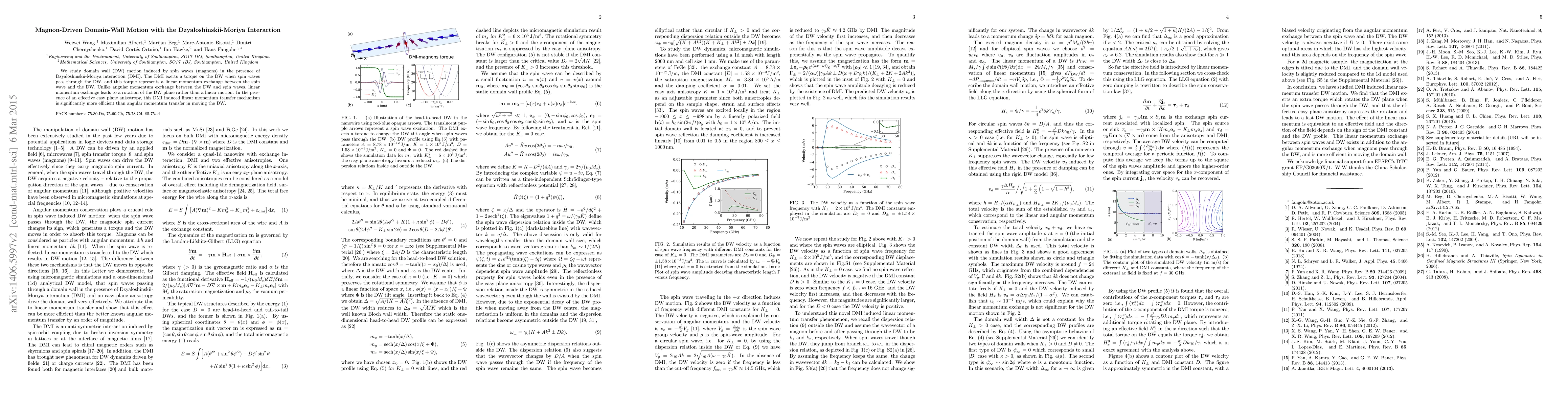 This paper investigates the motion of domain walls driven by spin waves in the presence of Dzyaloshinskii-Moriya interaction, revealing that linear momentum exchange, rather than angular momentum, causes the domain wall to rotate. This mechanism is notably more effective in the presence of an easy plane anisotropy.