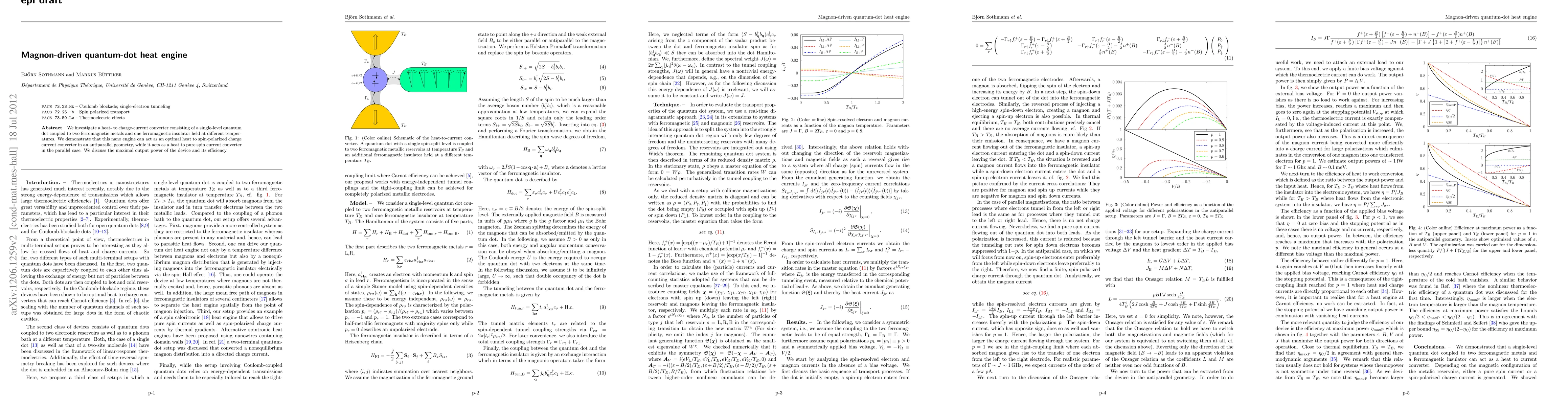 This paper explores a quantum dot heat engine that converts thermal energy into spin-polarized charge currents via ferromagnetic materials, demonstrating optimal efficiency in both antiparallel and parallel configurations, and analyzes the device's maximum output power and efficiency.
