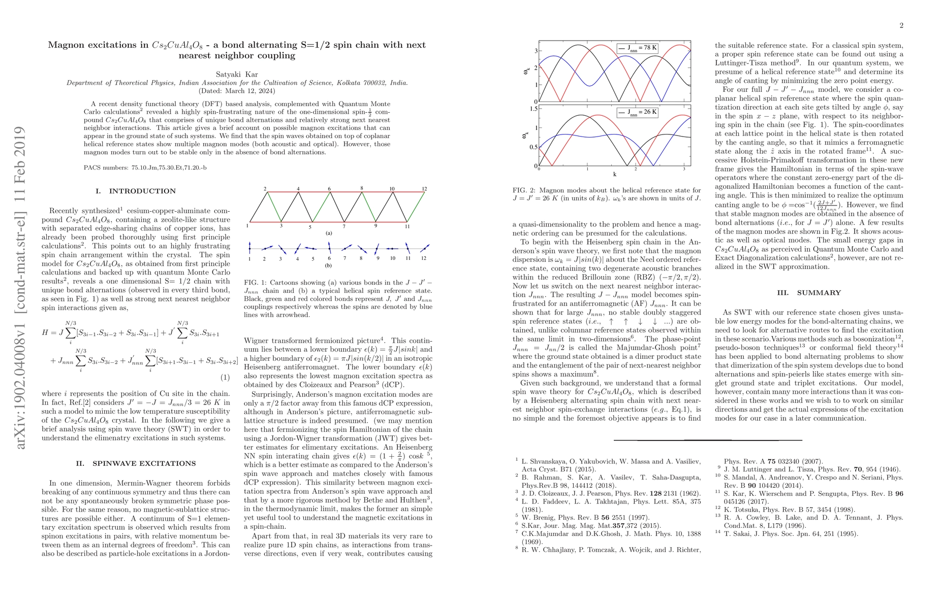 A recent density functional theory (DFT) based analysis, complemented with Quantum Monte Carlo calculations revealed a highly spin-frustrating nature of the one-dimensional spin-$\frac{1}{2}$ compound $Cs_2CuAl_4O_8$ that comprises of unique bond alternations and relatively strong next nearest neighbor interactions. This article gives a brief account on possible magnon excitations that can appear in the ground state of such systems. We find that the spin waves obtained on top of coplanar helical reference states show multiple magnon modes (both acoustic and optical). However, those magnon modes turn out to be stable only in the absence of bond alternations.
