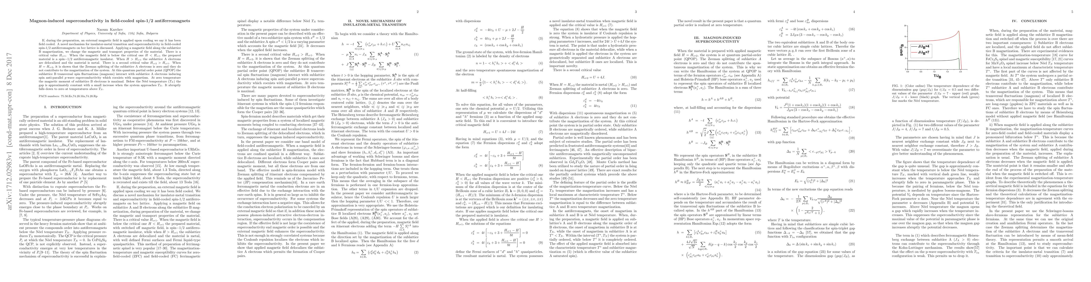 This paper explores a novel mechanism for superconductivity in field-cooled spin-$1/2$ antiferromagnets on a bcc lattice, where magnons induce superconductivity at a quantum partial order point when the magnetic field reaches a critical value. The material transitions from an insulator to a metal and exhibits superconductivity coexisting with magnetism at specific field strengths.
