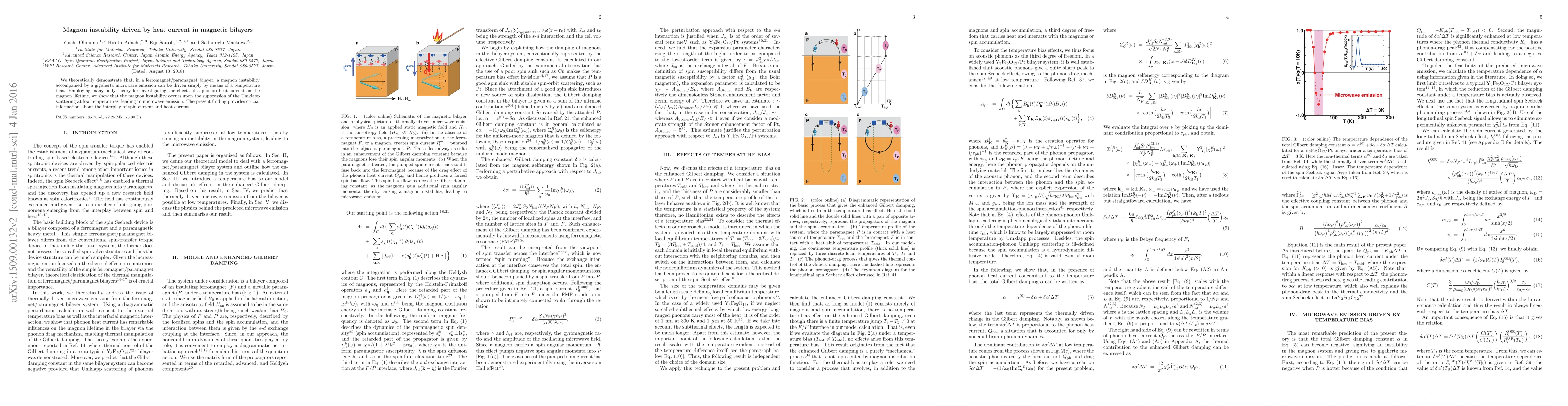 This paper theoretically shows that a magnon instability in a ferromagnet/paramagnet bilayer, resulting in gigahertz microwave emission, can be driven by a temperature bias. The study reveals that the instability arises from the suppression of Umklapp scattering at low temperatures, highlighting the interplay between spin and heat currents.