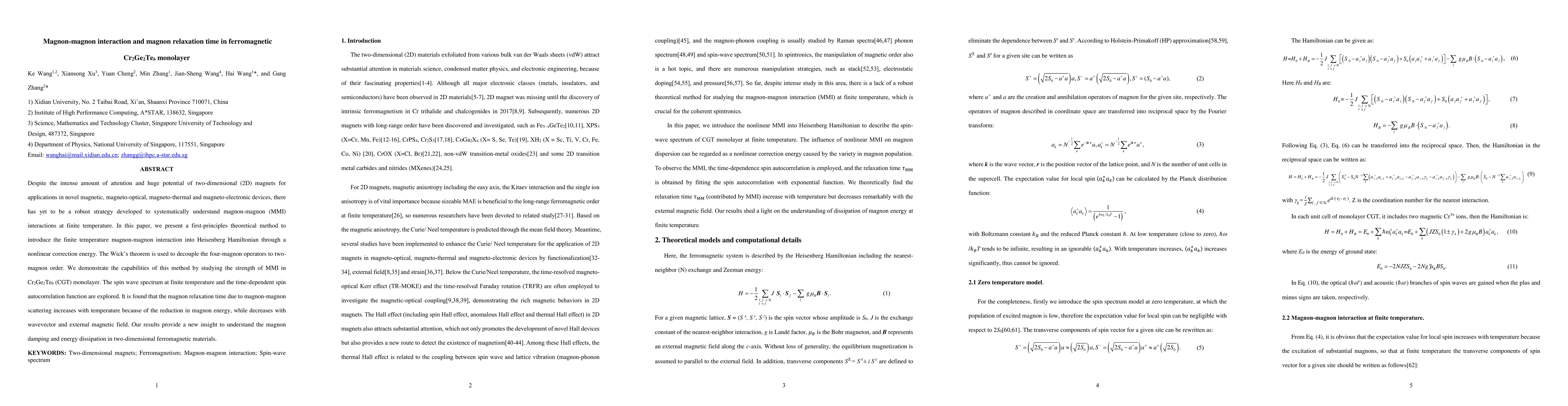 Despite the intense amount of attention and huge potential of two-dimensional (2D) magnets for applications in novel magnetic, magneto-optical, magneto-thermal and magneto-electronic devices, there has yet to be a robust strategy developed to systematically understand magnon-magnon (MMI) interactions at finite temperature. In this paper, we present a first-principles theoretical method to introduce the finite temperature magnon-magnon interaction into Heisenberg Hamiltonian through a nonlinear correction energy. The Wick theorem is used to decouple the four-magnon operators to two-magnon order. We demonstrate the capabilities of this method by studying the strength of MMI in Cr2Ge2Te6 (CGT) monolayer. The spin wave spectrum at finite temperature and the time-dependent spin autocorrelation function are explored. It is found that the magnon relaxation time due to magnon-magnon scattering increases with temperature because of the reduction in magnon energy, while decreases with wavevector and external magnetic field. Our results provide a new insight to understand the magnon damping and energy dissipation in two-dimensional ferromagnetic materials.