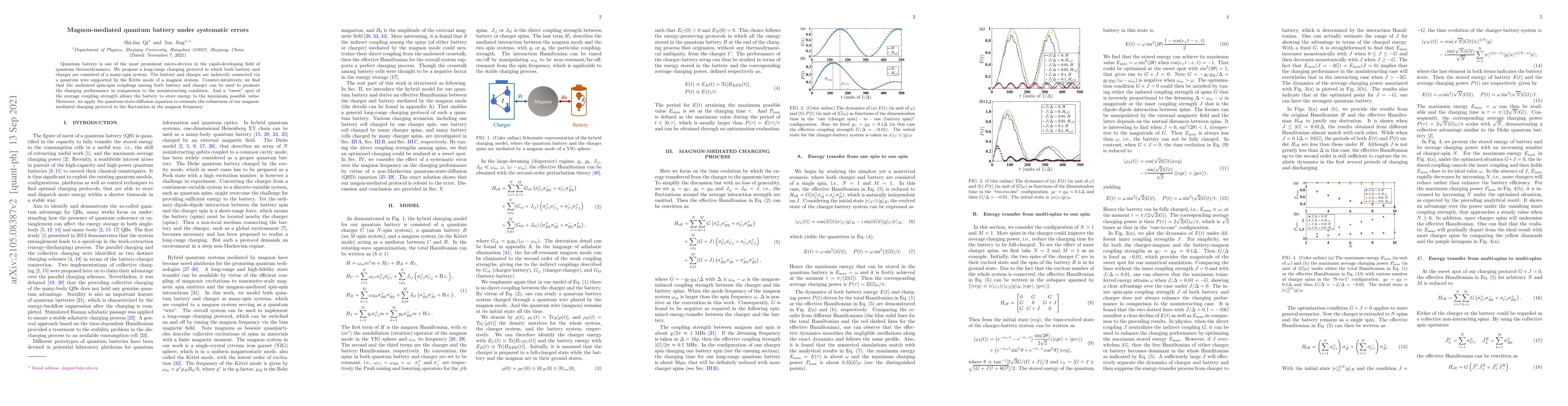 This paper proposes a magnon-mediated quantum charging protocol for a quantum battery, where both the battery and charger are made of many-spin systems connected via Kittle mode magnons. The study finds that optimal spin-spin coupling within the systems enhances charging performance, achieving remarkable efficiency at a specific coupling strength, and examines the protocol's robustness against systematic errors in magnon frequency using the quantum-state-diffusion equation.