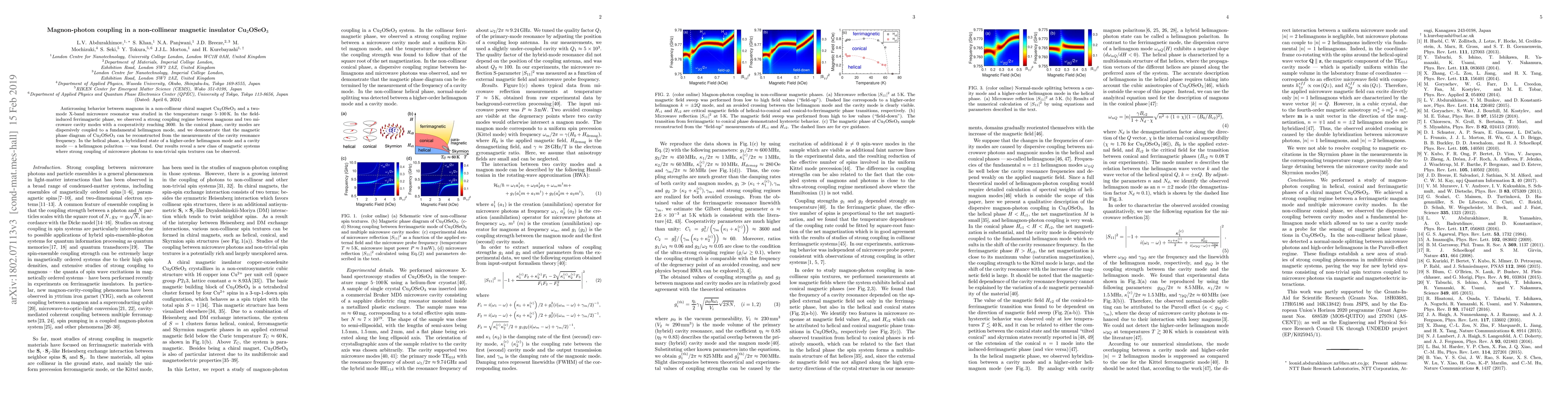 This study investigates magnon-photon coupling in the non-collinear magnetic insulator Cu$_2$OSeO$_3$, revealing strong coupling in the ferrimagnetic phase and hybridized helimagnon polaritons in the helical phase, demonstrating the potential for new magnetic systems with significant microwave-spin interactions.