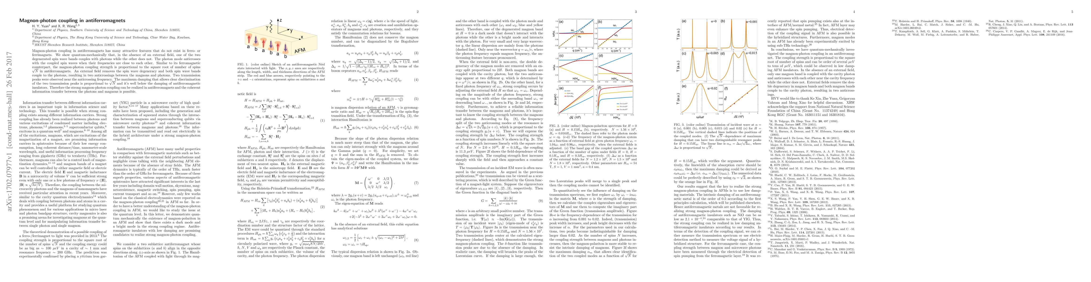 This paper demonstrates quantum-mechanically that magnon-photon coupling in antiferromagnets, unlike ferro- or ferrimagnets, allows one spin wave band to couple with photons while the other does not, leading to distinct anticrossing phenomena. The study also reveals that an external field can induce coupling for both spin wave bands, facilitating coherent information transfer.