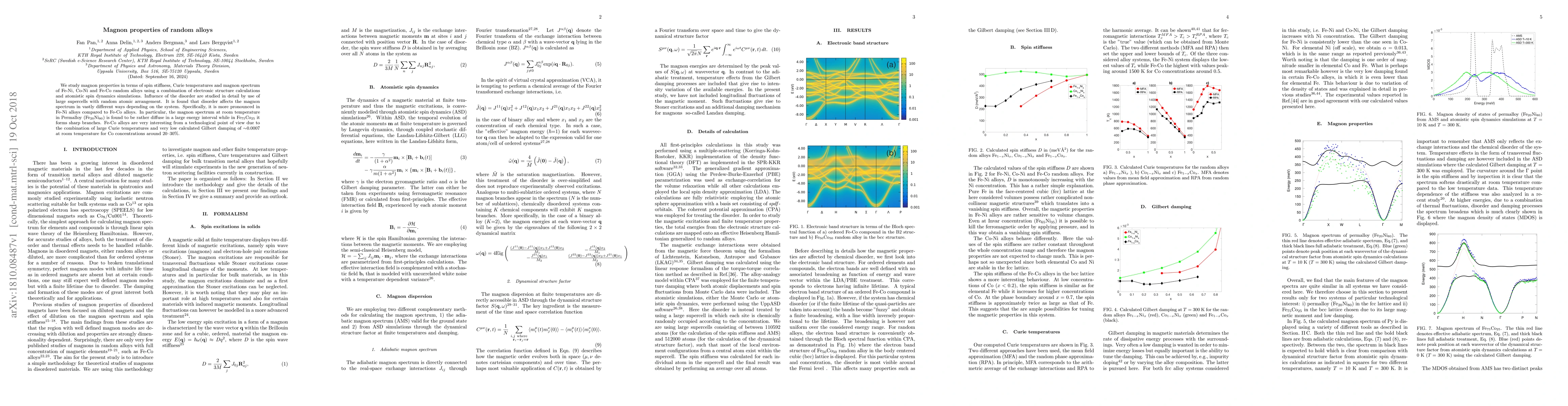 We study magnon properties in terms of spin stiffness, Curie temperatures and magnon spectrum of Fe-Ni, Co-Ni and Fe-Co random alloys using a combination of electronic structure calculations and atomistic spin dynamics simulations. Influence of the disorder are studied in detail by use of large supercells with random atomic arrangement. It is found that disorder affects the magnon spectrum in vastly different ways depending on the system. Specifically, it is more pronounced in Fe-Ni alloys compared to Fe-Co alloys. In particular, the magnon spectrum at room temperature in Permalloy (Fe$_{20}$Ni$_{80}$) is found to be rather diffuse in a large energy interval while in Fe$_{75}$Co$_{25}$ it forms sharp branches. Fe-Co alloys are very interesting from a technological point of view due to the combination of large Curie temperatures and very low calculated Gilbert damping of $\sim$0.0007 at room temperature for Co concentrations around 20--30\%.