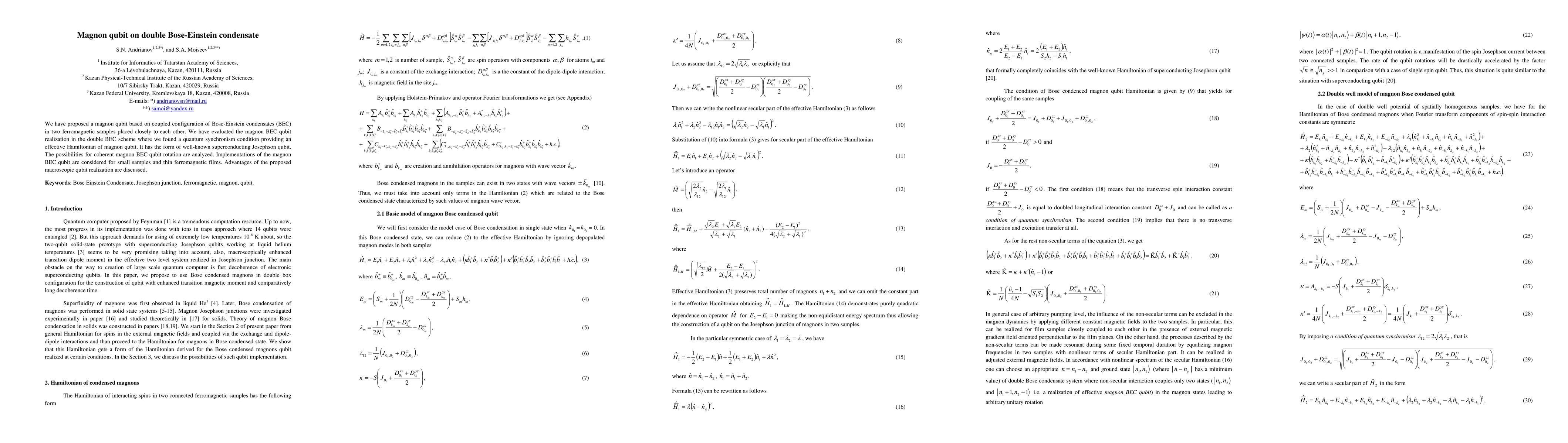 This paper proposes a magnon qubit based on coupled Bose-Einstein condensates in two ferromagnetic samples, revealing a quantum synchronism condition that leads to an effective Hamiltonian similar to a superconducting Josephson qubit. The study discusses potential implementations and advantages for small samples and thin ferromagnetic films.
