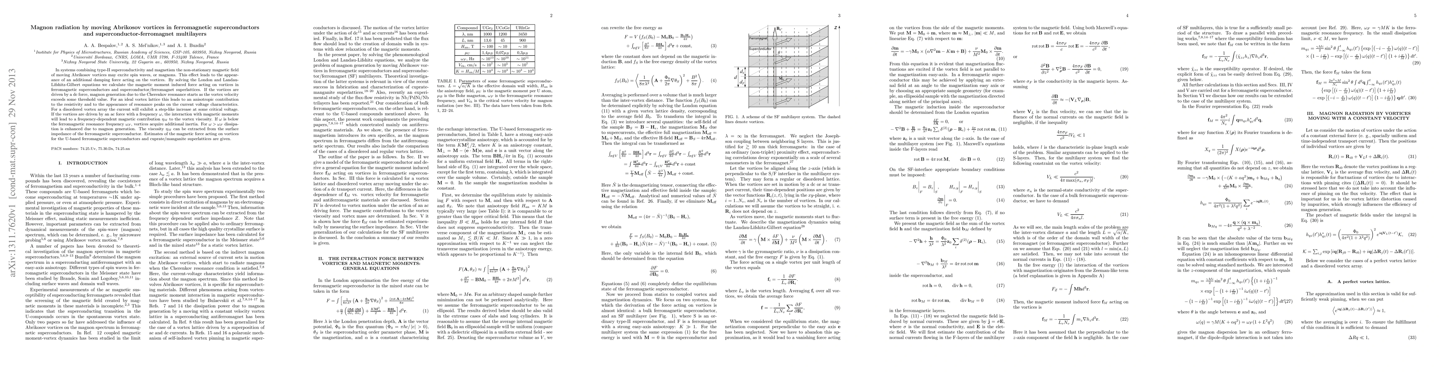 This research investigates magnon radiation from moving Abrikosov vortices in ferromagnetic superconductors and superlattices, revealing that vortex motion can excite spin waves. It demonstrates that the magnetic force on vortices, computed through London and Landau-Lifshitz-Gilbert equations, generates additional damping and influences vortex dynamics, resistivity, and current-voltage characteristics in these systems.