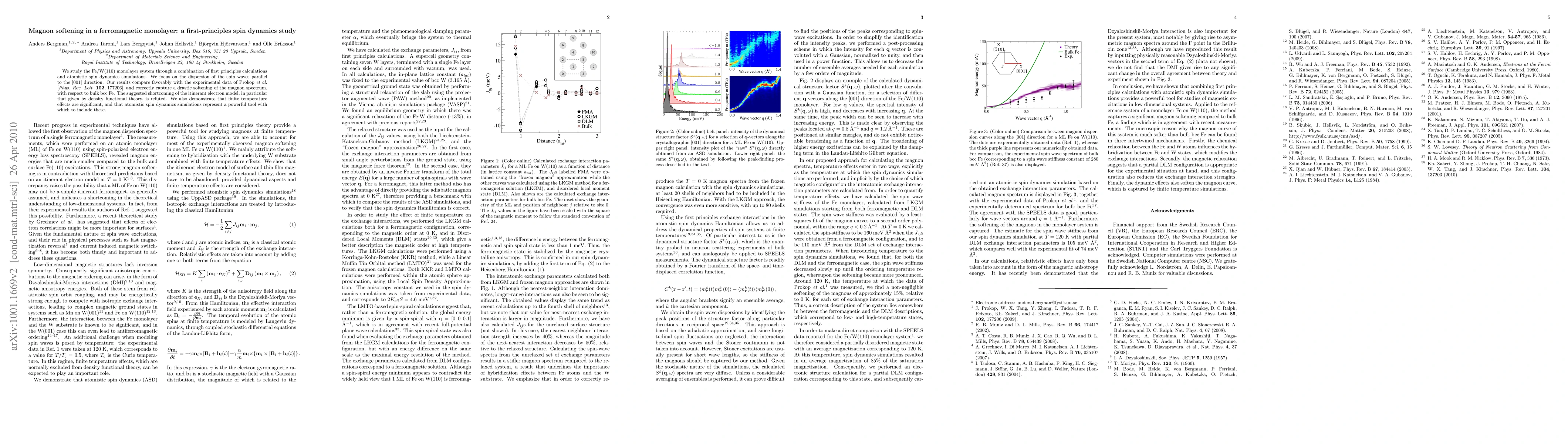 The paper presents a first-principles spin dynamics study that accurately calculates exchange parameters and demonstrates the importance of finite temperature effects in magnon softening in ferromagnetic monolayers.