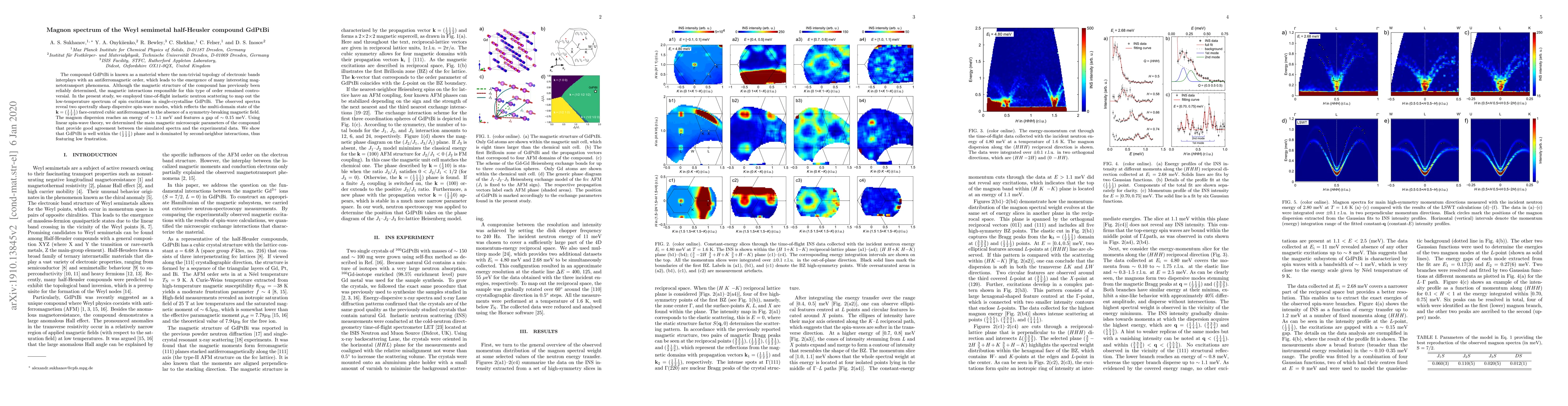The study uses time-of-flight inelastic neutron scattering to map the spin excitation spectrum of GdPtBi, a Weyl semimetal half-Heusler compound. It reveals two sharp dispersive spin-wave modes, confirming a (( rac{1}{2} rac{1}{2} rac{1}{2} )) antiferromagnetic order, dominated by second-neighbor interactions and low frustration, with a maximum energy of ~1.1 meV and a ~0.15 meV gap.