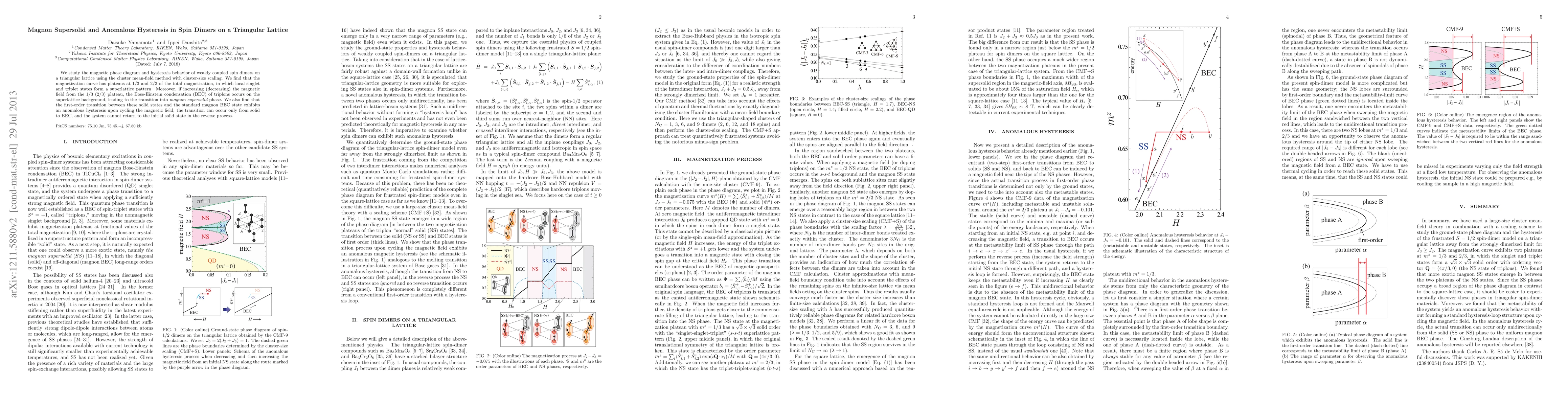 This paper investigates the magnetic phase diagram and hysteresis in spin dimers on a triangular lattice, revealing plateaus in magnetization and a magnon supersolid phase formed via triplon condensation. Anomalous hysteresis is observed in the first-order transition between the supersolid and standard magnon states.
