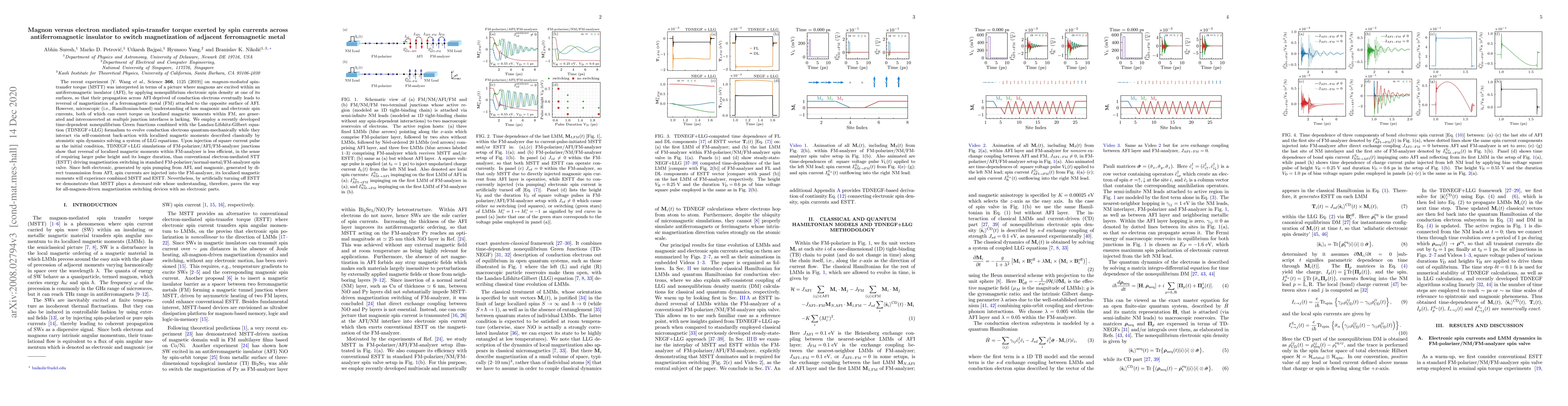 The recent experiment [Y. Wang et al., Science 366, 1125 (2019)] on magnon-mediated spin-transfer torque (MSTT) was interpreted in terms of a picture where magnons are excited within an antiferromagnetic insulator (AFI), by applying nonequilibrium electronic spin density at one of its surfaces, so that their propagation across AFI deprived of conduction electrons eventually leads to reversal of magnetization of a ferromagnetic metal (FM) attached to the opposite surface of AFI. We employ a recently developed time-dependent nonequilibrium Green functions combined with the Landau-Lifshitz-Gilbert equation (TDNEGF+LLG) formalism to evolve conduction electrons quantum-mechanically while they interact via self-consistent back-action with localized magnetic moments described classically by atomistic spin dynamics solving a system of LLG equations. Upon injection of square current pulse as the initial condition, TDNEGF+LLG simulations of FM-polarizer/AFI/FM-analyzer junctions show that reversal of localized magnetic moments within FM-analyzer is less efficient, in the sense of requiring larger pulse height and its longer duration, than conventional electron-mediated STT (ESTT) driving magnetization switching in standard FM-polarizer/normal-metal/FM-analyzer spin valve. Since both electronic, generated by spin pumping from AFI, and magnonic, generated by direct transmission from AFI, spin currents are injected into the FM-analyzer, its localized magnetic moments will experience combined MSTT and ESTT. Nevertheless, by artificially turning off ESTT we demonstrate that MSTT plays a dominant role whose understanding, therefore, paves the way for all-magnon-driven magnetization switching devices with no electronic parts.