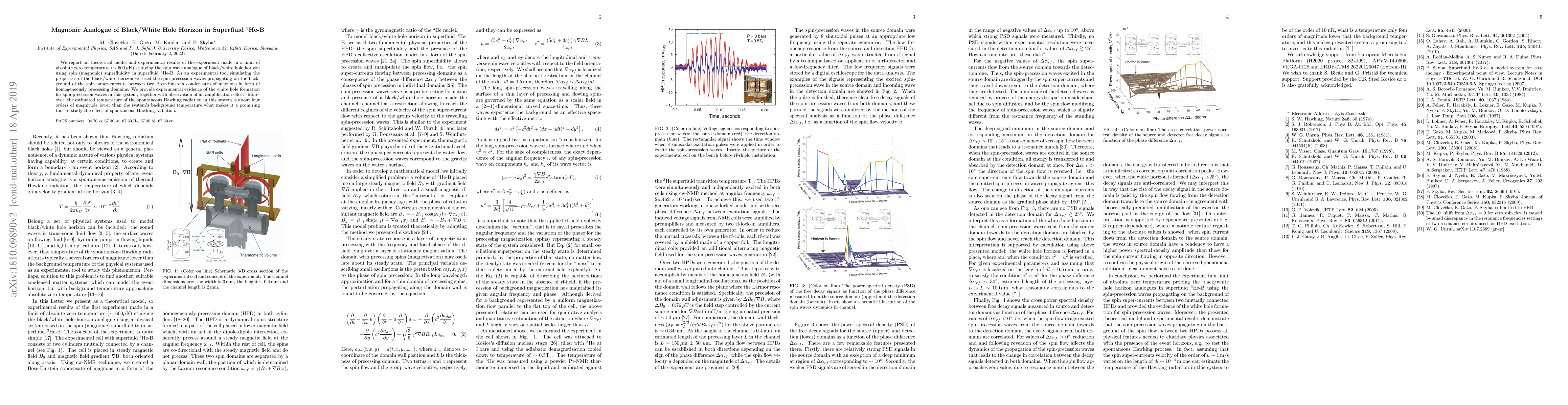 We report on theoretical model and experimental results of the experiment made in a limit of absolute zero temperature ($\sim$ 600\,$\mu$K) studying the spin wave analogue of black/white hole horizon using spin (magnonic) superfluidity in superfluid $^3$He-B. As an experimental tool simulating the properties of the black/white horizon we used the spin-precession waves propagating on the background of the spin super-currents between two Bose-Einstein condensates of magnons in form of homogeneously precessing domains. We provide experimental evidence of the white hole formation for spin precession waves in this system, together with observation of an amplification effect. Moreover, the estimated temperature of the spontaneous Hawking radiation in this system is about four orders of magnitude lower than the system's background temperature what makes it a promising tool to study the effect of spontaneous Hawking radiation.