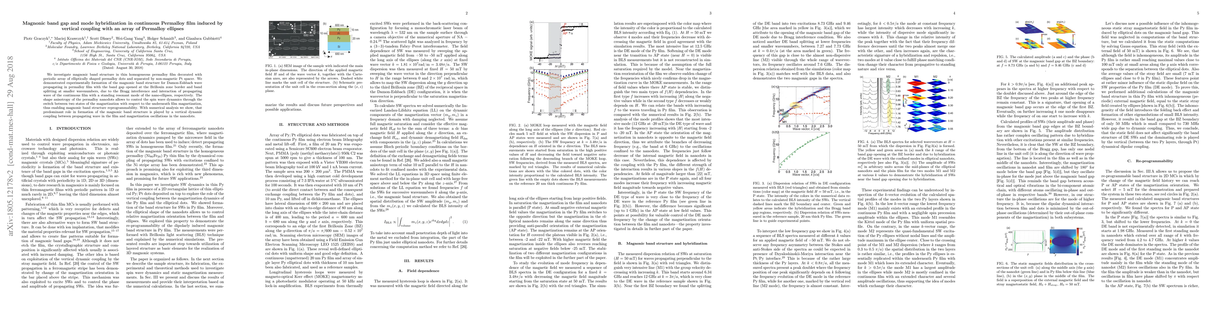 The paper presents an experimental and theoretical investigation of spin wave propagation in a patterned Permalloy film, demonstrating the formation of a magnonic band structure with a band gap and mode hybridization induced by vertical coupling with an array of Permalloy ellipses.