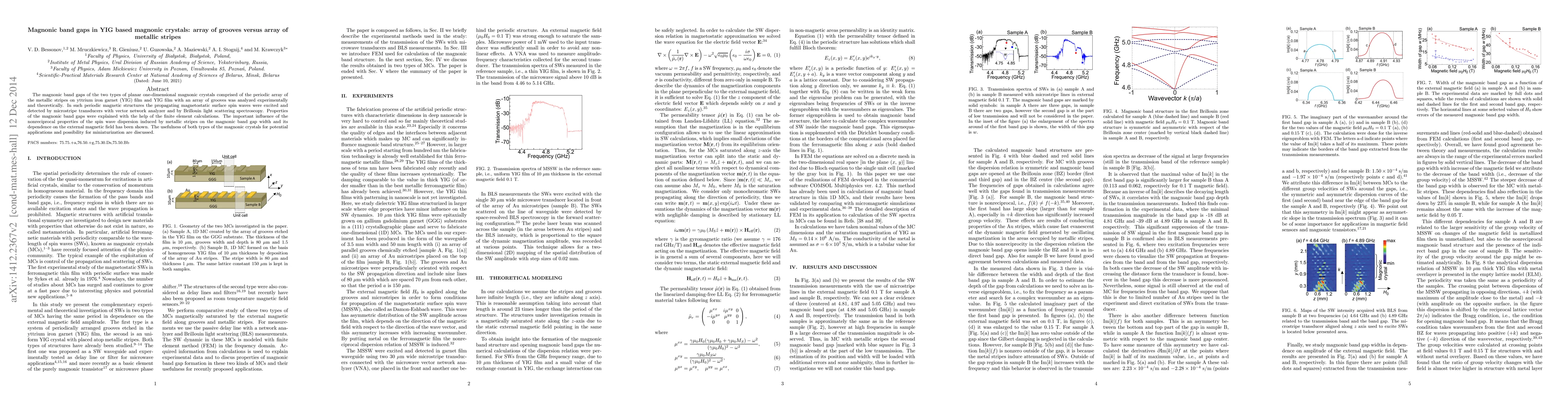 This paper investigates the magnonic band gaps in YIG-based magnonic crystals with either metallic stripes or grooves. Experimental and theoretical analyses reveal the influence of metallic stripes on the band gap width and its magnetic field dependence, highlighting the potential applications and miniaturization possibilities of these structures.