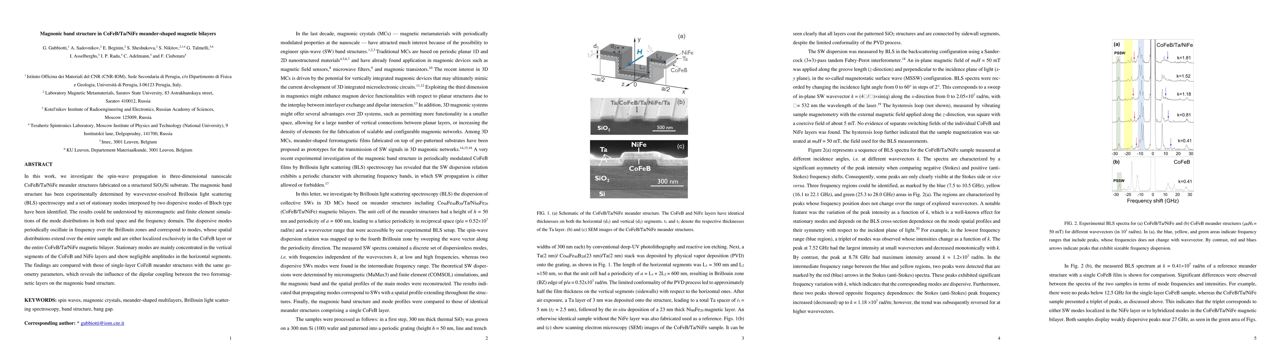 This study investigates spin-wave propagation in CoFeB/Ta/NiFe meander structures using Brillouin light scattering, identifying dispersive and stationary modes. The results reveal the influence of dipolar coupling between ferromagnetic layers on the magnonic band structure.