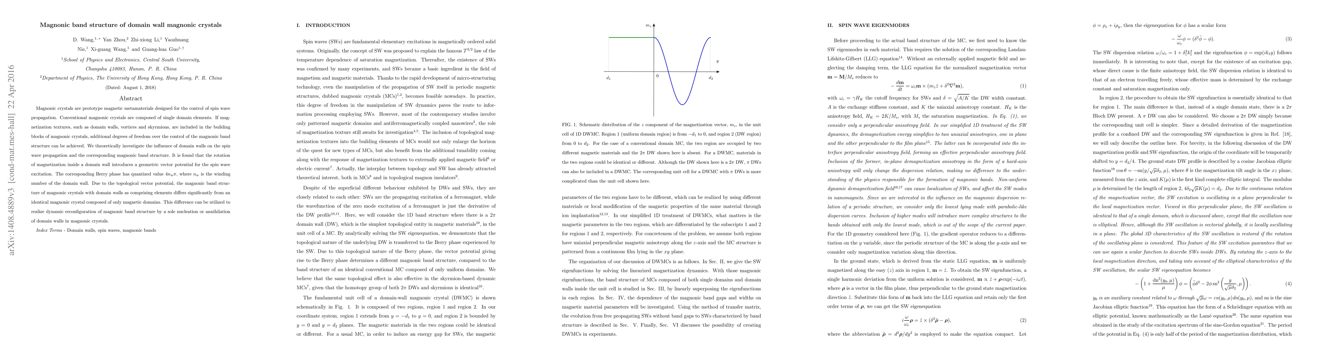 This paper investigates how domain walls in magnonic crystals affect spin wave propagation and magnonic band structure, revealing that the magnetization rotation within a domain wall creates a topological vector potential, leading to distinct magnonic band configurations and enabling dynamic reconfiguration of the band structure.