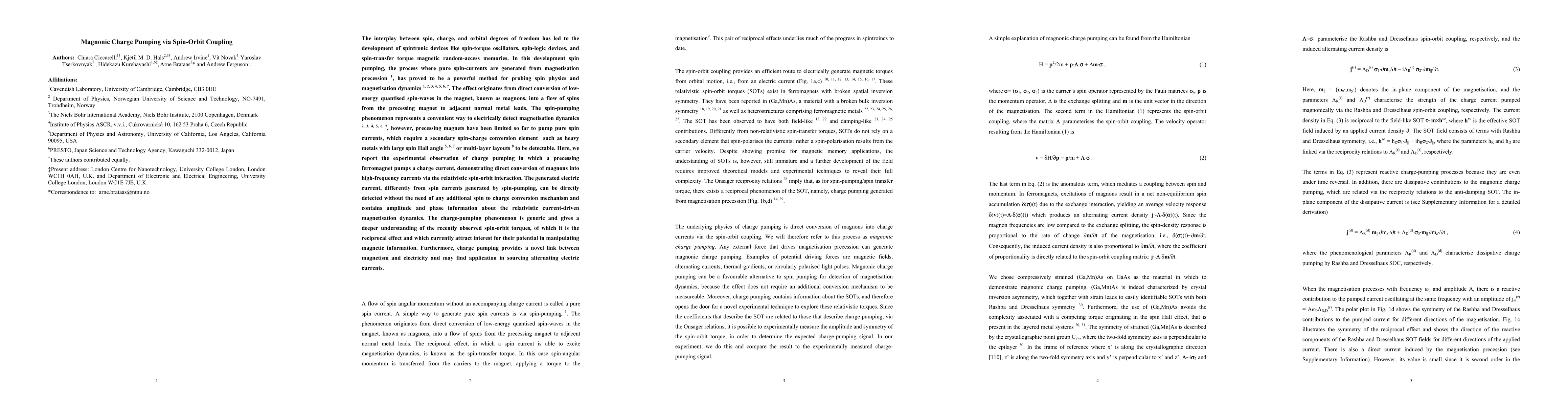 This paper reports the experimental observation of magnonic charge pumping through spin-orbit coupling, demonstrating direct conversion of magnons into high-frequency electric currents. This novel phenomenon allows for direct detection of the resulting current without additional conversion mechanisms, offering potential applications in generating alternating electric currents.