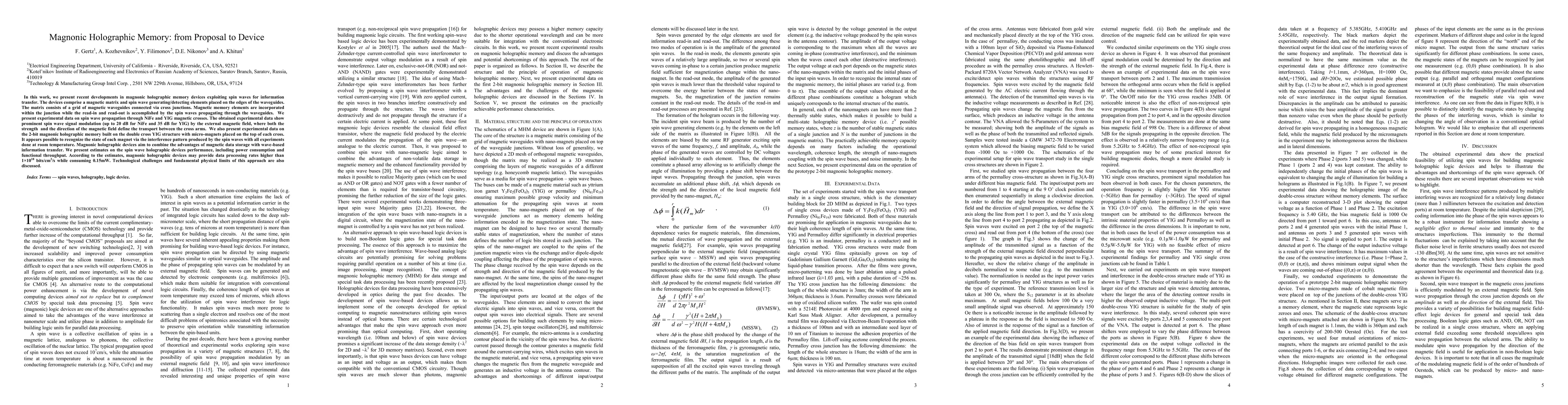 This paper details advancements in magnonic holographic memory devices, utilizing spin waves for data storage and transfer. Experimental results show significant spin wave modulation by magnetic fields in NiFe and YIG, enabling 2-bit memory recognition via interference patterns at room temperature. The proposed devices promise high data processing rates and low power consumption.