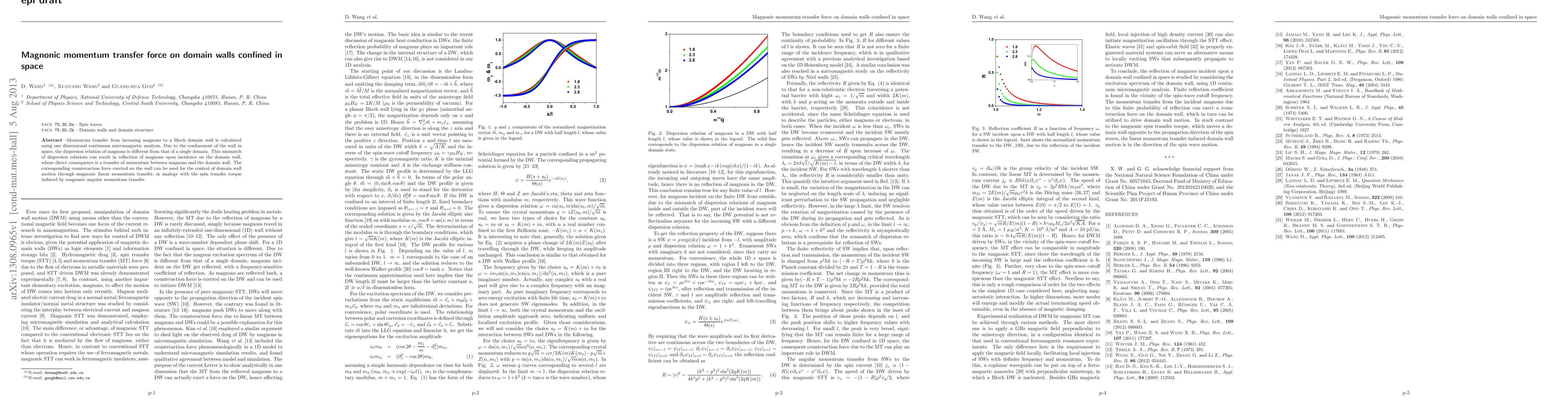 This paper investigates the momentum transfer from magnons to a confined Bloch domain wall using micromagnetic analysis, revealing that the unique dispersion relation due to spatial confinement can cause magnon reflection and momentum exchange, leading to a counteraction force that can control domain wall motion. This magnonic momentum transfer mechanism parallels spin transfer torque from angular momentum transfer.