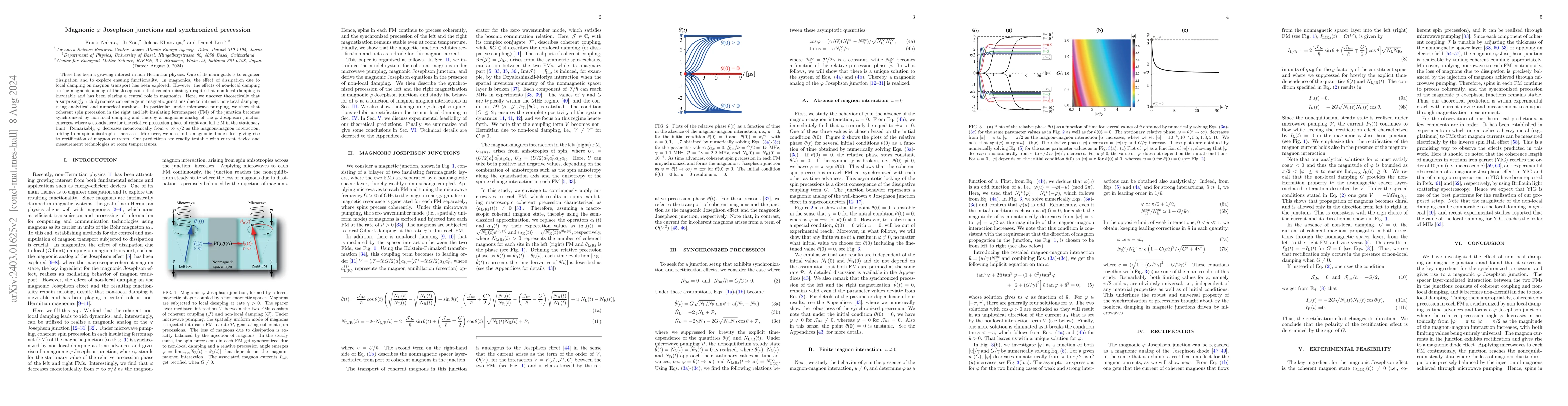 There has been a growing interest in non-Hermitian physics. One of its main goals is to engineer dissipation and to explore ensuing functionality. In magnonics, the effect of dissipation due to local damping on magnon transport has been explored. However, the effects of non-local damping on the magnonic analog of the Josephson effect remain missing, despite that non-local damping is inevitable and has been playing a central role in magnonics. Here, we uncover theoretically that a surprisingly rich dynamics can emerge in magnetic junctions due to intrinsic non-local damping, using analytical and numerical methods. In particular, under microwave pumping, we show that coherent spin precession in the right and left insulating ferromagnet (FM) of the junction becomes synchronized by non-local damping and thereby a magnonic analog of the $\varphi$ Josephson junction emerges, where $\varphi$ stands here for the relative precession phase of right and left FM in the stationary limit. Remarkably, $\varphi$ decreases monotonically from $ \pi$ to $\pi/2$ as the magnon-magnon interaction, arising from spin anisotropies, increases. Moreover, we also find a magnonic diode effect giving rise to rectification of magnon currents. Our predictions are readily testable with current device and measurement technologies at room temperatures.