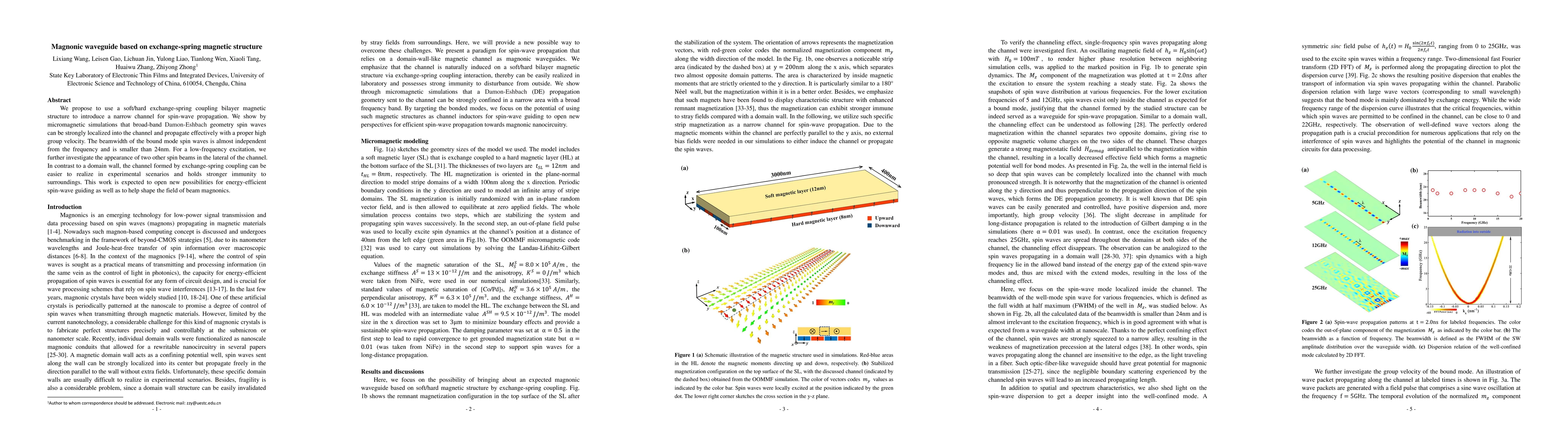 We propose to use a soft/hard exchange-spring coupling bilayer magnetic structure to introduce a narrow channel for spin-wave propagation. We show by micromagnetic simulations that broad-band Damon-Eshbach geometry spin waves can be strongly localized into the channel and propagate effectively with a proper high group velocity. The beamwidth of the bound mode spin waves is almost independent from the frequency and is smaller than 24nm. For a low-frequency excitation, we further investigate the appearance of two other spin beams in the lateral of the channel. In contrast to a domain wall, the channel formed by exchange-spring coupling can be easier to realize in experimental scenarios and holds stronger immunity to surroundings. This work is expected to open new possibilities for energy-efficient spin-wave guiding as well as to help shape the field of beam magnonics.
