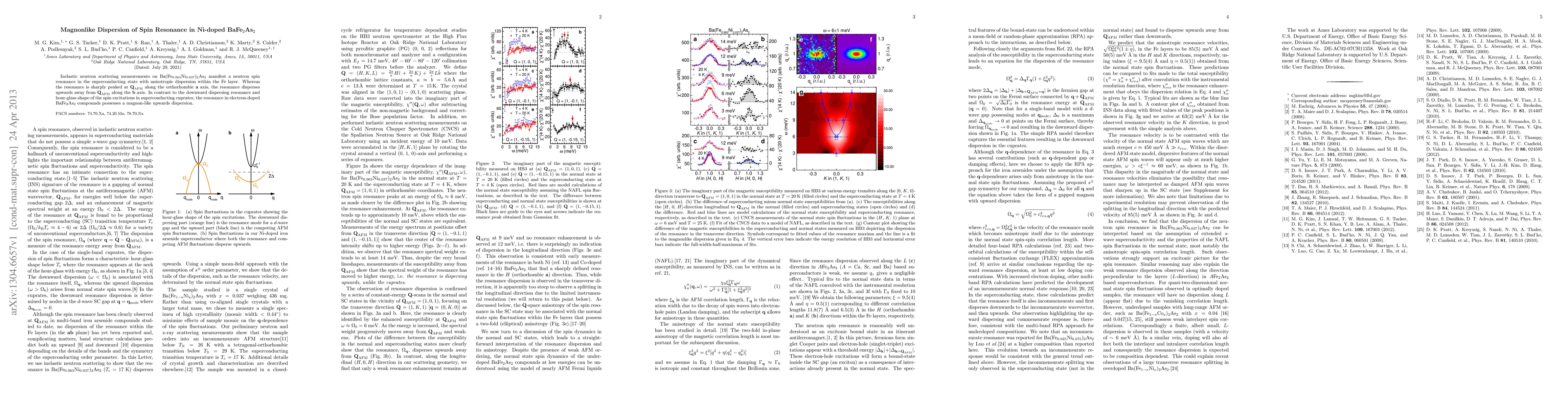 This study reveals an anisotropic magnon-like dispersion of spin resonance in Ni-doped BaFe$_2$As$_2$ observed via inelastic neutron scattering, showing an upward dispersion along the b axis in contrast to the downward dispersion seen in cuprate superconductors. The resonance peaks at Q$_{AFM}$ along the a axis.