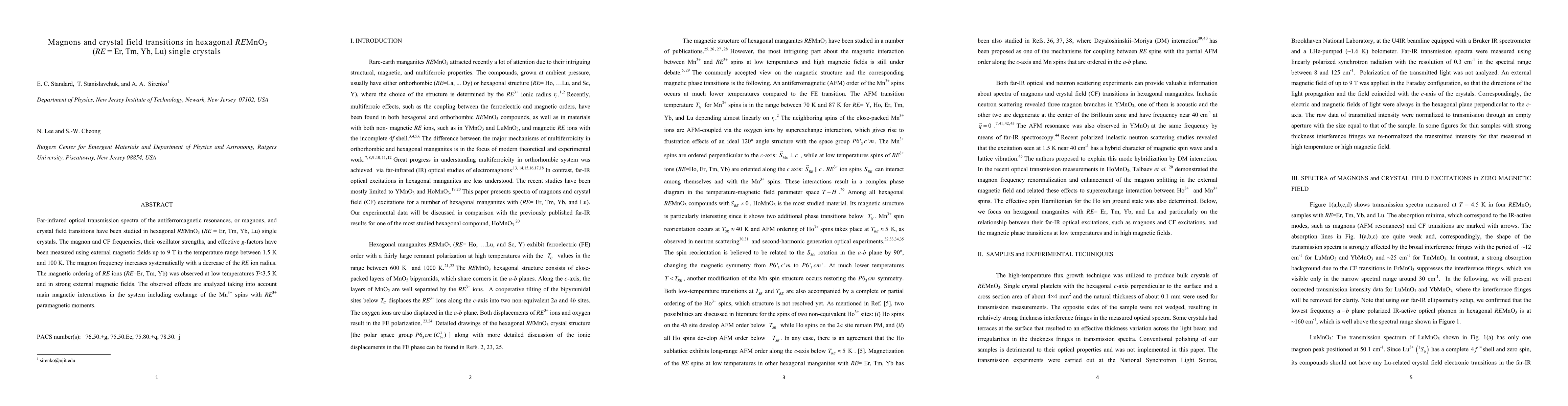 The study examines magnons and crystal field transitions in Er, Tm, Yb, Lu-doped hexagonal MnO3 single crystals. Utilizing far-infrared optical transmission, researchers measured magnon and crystal field frequencies, oscillator strengths, and effective g-factors under magnetic fields up to 9 T and temperatures from 1.5 K to 100 K. Key findings include a systematic increase in magnon frequency with decreasing RE ion radius and magnetic ordering of RE ions (Er, Tm, Yb) below 3.5 K and strong external magnetic fields. The analysis focuses on primary magnetic interactions, such as Mn3+ spin exchange with RE3+ paramagnetic moments.